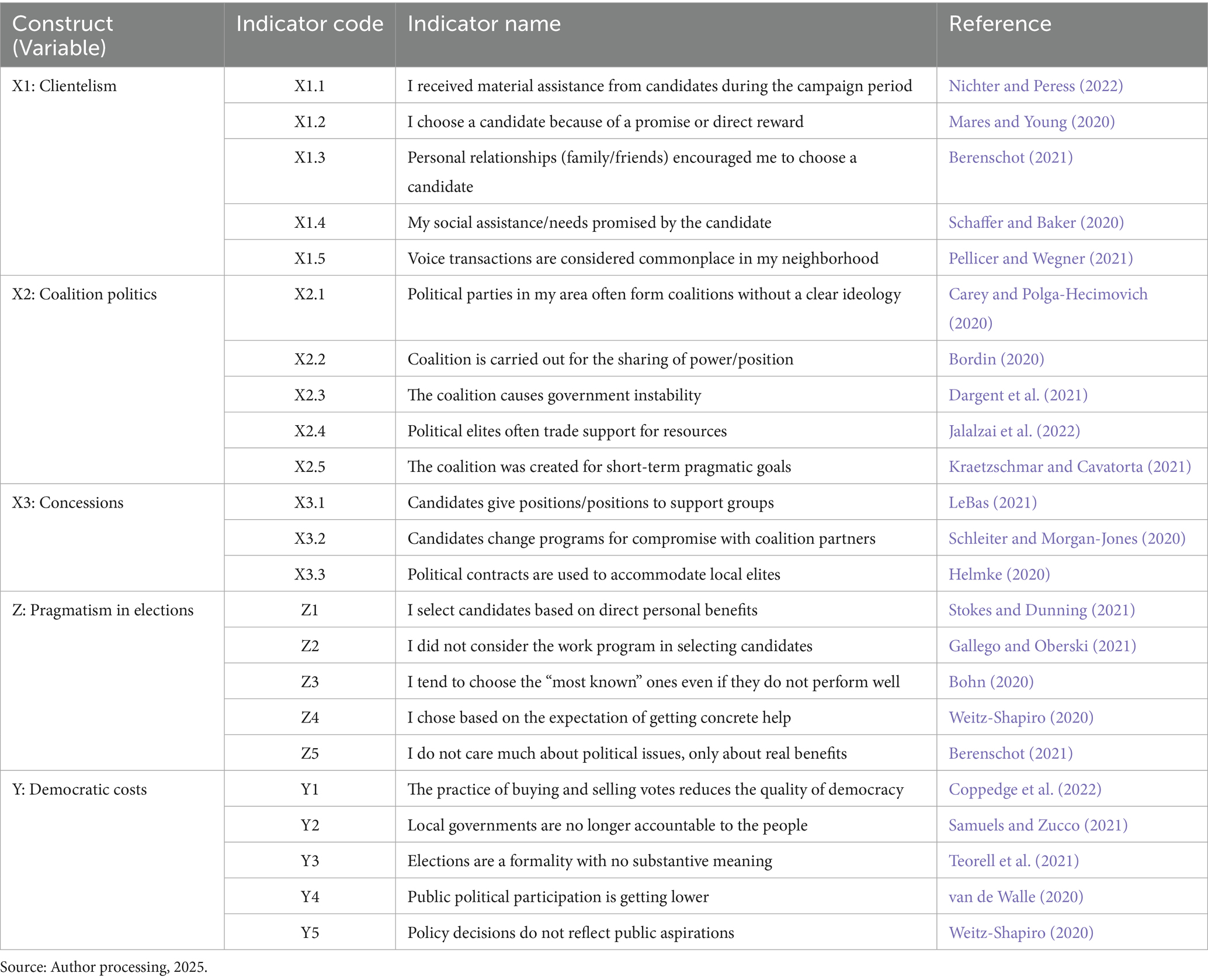 This study uses a quantitative approach with a structural model involving five main constructs, namely clientelism, coalition politics, concessions, pragmatism in elections, and democratic costs. Each construct is measured through a number of indicators developed based on theoretical studies and empirical findings in the scientific literature. The selection of indicators is carried out carefully to represent the conceptual dimensions of each variable in a valid and reliable manner (Hair et al., 2020). Clientelism (X1): It is measured through indicators that reflect the pattern of transactional relationships between voters and candidates, such as receiving material assistance, promises of political rewards, and public perception of the normalization of vote exchange in local elections.