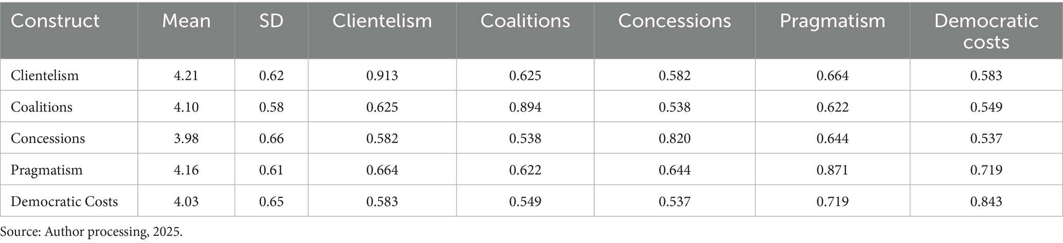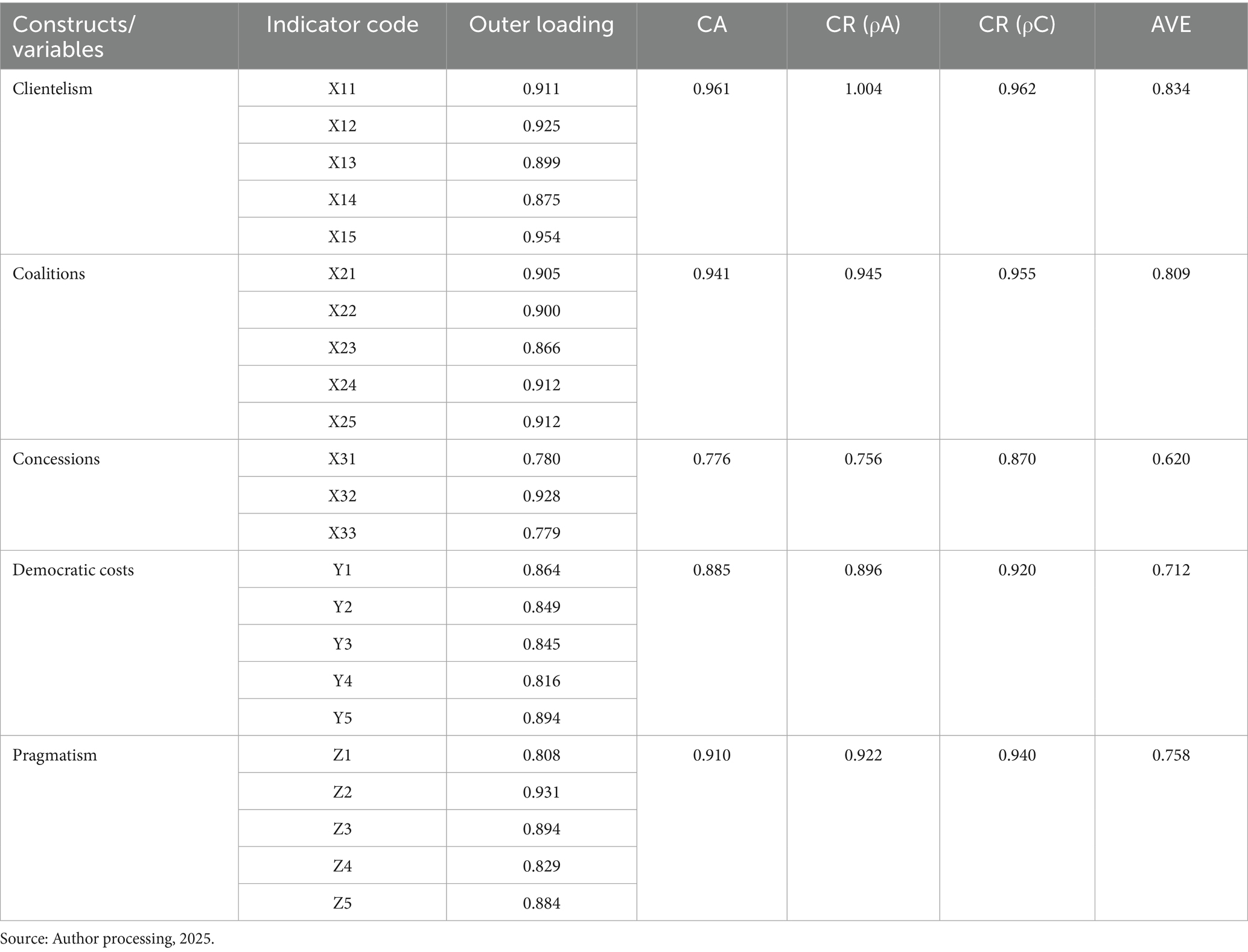 At the evaluation stage of the measurement model (outer model), there are three main aspects that need to be considered: internal reliability, validitas convergence, and discriminatory validity (Ringle et al., 2020). Internal reliability is measured through Cronbach’s Alpha (CA) and Composite Reliability (CR). A good Cronbach’s alpha value is above 0.70, which indicates that the indicators in a construct have adequate internal consistency (Danks and Allen, 2021). Composite reliability (both in rho A and rho C forms) is considered superior to Cronbach’s alpha because it considers the actual weight of each indicator in the model. More than that, validitas convergence is quantified using Average Variance Extracted (AVE), which reflects how much variation in the indicator can be explained by the latent construct. An appropriate AVE value exceeds 0.50, which means that more than half of the variance of the indicator is adequately interpreted by the construct it represents. In the context of this study, all constructs have met the minimum threshold for each test indicator. The values of CA, CR, and AVE indicate that this research instrument has a high level of reliability and convergent validity. This reinforces the belief that construct measurements such as clientelism, coalition politics, concessions, pragmatism, and democratic costs are done accurately and trustworthily (Ali and Ghauri, 2020).