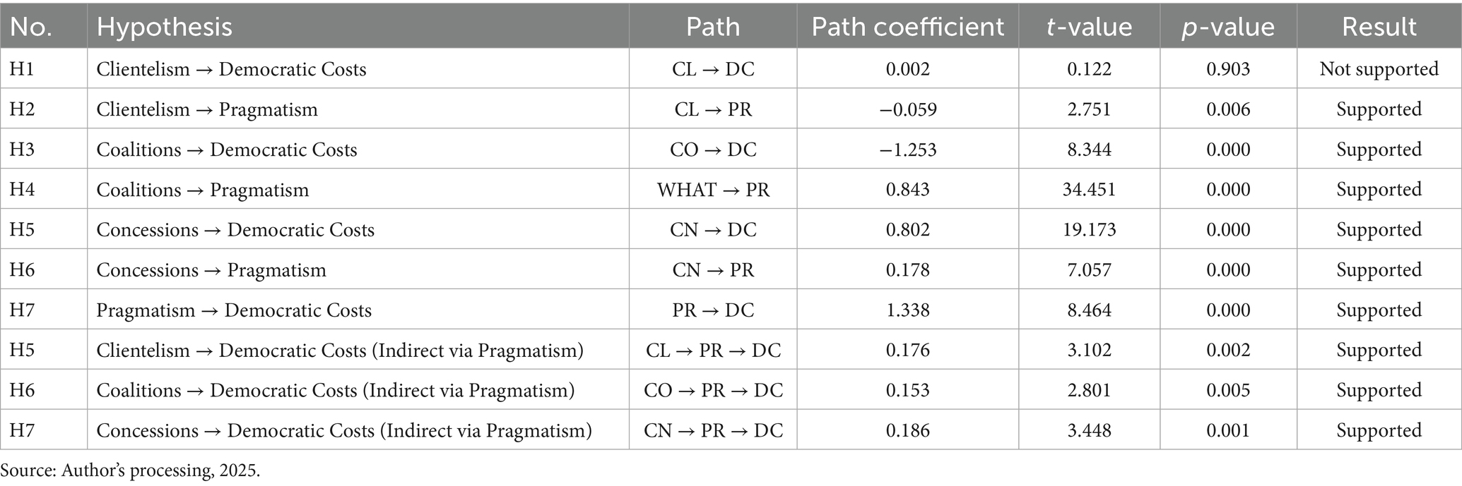 After the measurement model is declared valid and reliable, the next stage in the PLS-SEM analysis is to evaluate the structural model. This stage aims to assess the strength and significance of causal relationships between latent constructs through path coefficient (β) estimation and p-value. Structural models play an important role in testing hypotheses that have been formulated, as well as measuring the magnitude of the direct, indirect, and total influences between variables in the conceptual framework. In the context of studying the relationship between clientelism, coalitions, and concessions to pragmatism in local elections, as well as its consequences for democratic costs, structural model evaluation provides a solid quantitative basis for proving or rejecting the hypothesis proposed. Therefore, the discussion of the path coefficient and p-value is essential in demonstrating the theoretical relevance and empirical significance of each construct studied.