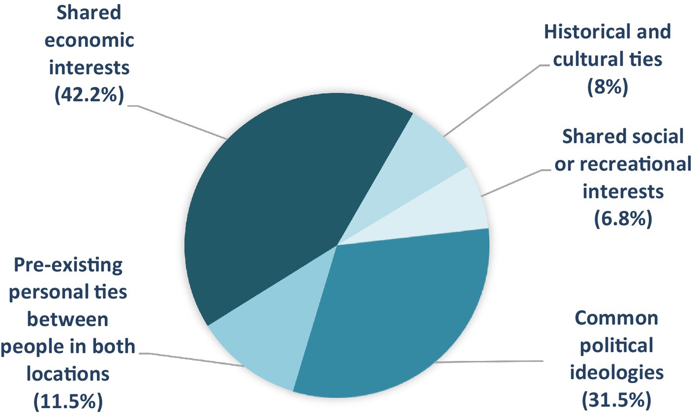 Pie chart showing factors influencing connections between subnational localities. Shared economic interests: 42.2%, common political ideologies: 31.5%, pre-existing personal ties: 11.5%, historical and cultural ties: 8%, and shared social or recreational interests: 6.8%.