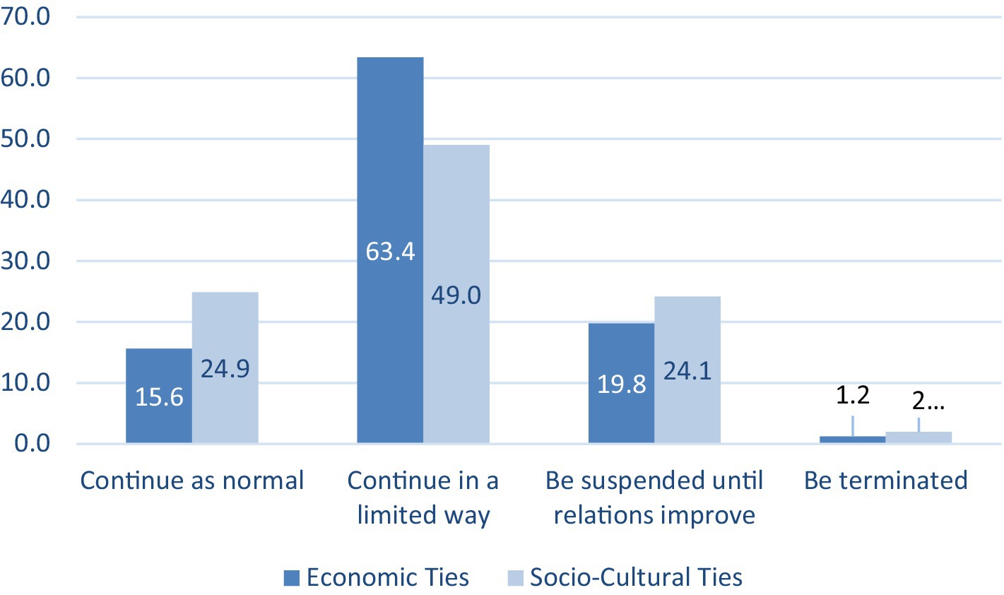 However, in terms of the importance of such issues for developing China’s international relations, respondents observed that diplomatic and subnational ties were relatively equal in status—97 and 96% of the respondents agreed that diplomatic relations and subnational relations, respectively, were important. However, economic ties were noted to be more important than sociocultural relations. More respondents (79.0%) believed that economic ties should be encouraged to continue, although in a limited manner, relative to sociocultural ties (73.9%) (Figure 2). The respondents noted that sociocultural relations were more vulnerable to bilateral tensions, with a greater proportion of those suggesting that they should be suspended or terminated during this period. Although the difference in these figures is not significant, it indicates a preference for safeguarding economic relationships. This, in turn, supports the previous observation that Chinese people may hold a more functional developmental view of subnational relations than the original Eisenhower construct.