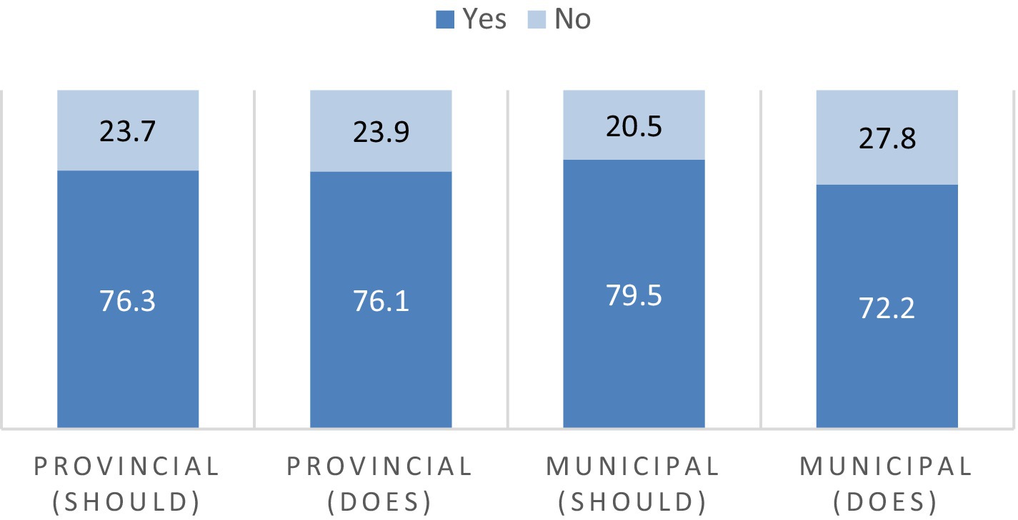 Given these findings, a secondary issue is whether people feel that their subnational governments listen to the public opinion when creating overseas partnerships. A significant majority of the respondents felt that both provincial and municipal governments sought the public’s opinion when developing links with their overseas counterparts (Figure 3). Similarly high responses were received when they were asked whether the central authorities should seek public opinion when formulating foreign policy. A total of 71% indicated that the central government should seek public opinion, and 72.4% indicated that they do seek public opinion when formulating foreign policy.