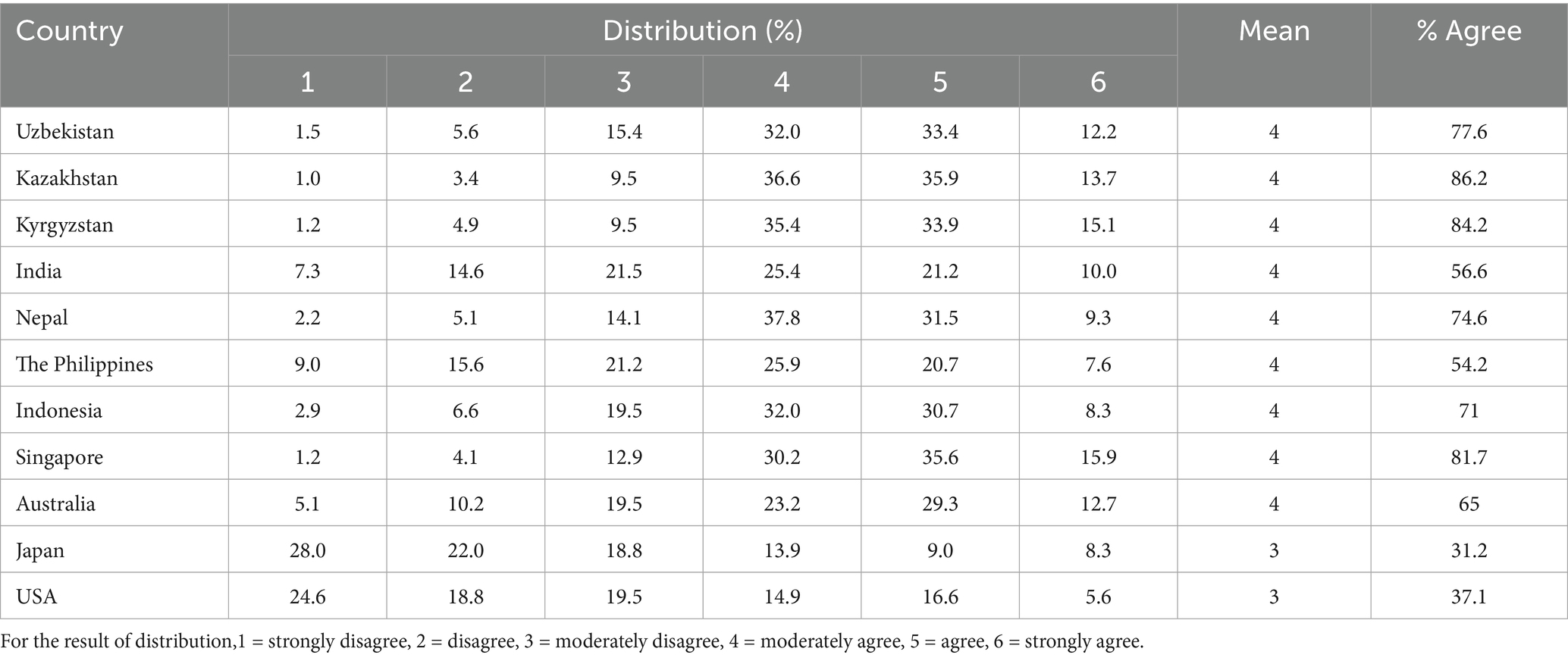 Given Kyrgyzstan’s BRI membership and its subnational ties with China, it is useful to consider the way Chinese people perceive the country and the importance they give to the various national and subnational aspects of this relationship. The respondents were overwhelmingly positive in their assessments of the Kyrgyz government and people. Of the respondents, 96.5% agreed that the Kyrgyzstan government had an overall friendly approach toward China. Similarly, 95.1% of the respondents felt the same about the Kyrgyz people. Although other survey data from Central Asia indicate that the Kyrgyz people are generally positive toward China (approximately 74.0%), these sentiments are more likely to be tempered by concerns related to the impact of Chinese projects and presence of Chinese workers (Neafie et al., 2024, p. 11, 13–14). These figures are comparable with those of other studies, which found that 76.3% of the Kyrgyz people held favorable views of China (Yau, 2024). The presence of China in Kyrgyzstan is significantly higher than that of Kyrgyzstan in China, which may explain the difference in the responses.