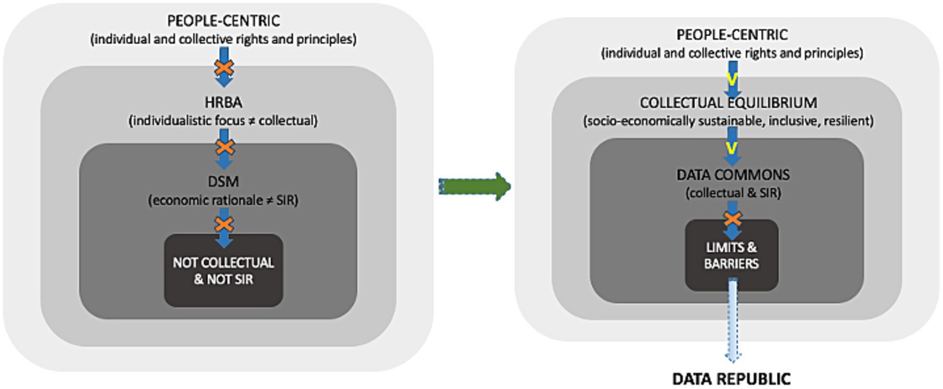 The article is organized as follows: Section 2 unpacks the notion of “people-centric” by conceptualizing its underpinning collectual equilibrium and operationalizing it in terms of socio-economic sustainability, inclusiveness, and resilience (SIR); Section 3 explores the EU’s digital strategy with regard to its HRBA and the emerging DSM, highlighting their individualistic focus and economic rationale which make the whole strategy not people-centric; Section 4 introduces the data commons as a collectual SIR regime for managing digital initiatives, while also highlighting current structural limits and substantial barriers; Section 5 builds on this analysis by outlining the features of the Data Republic as a theoretical setup that can help systemically overcome data commons’ limits and barriers and enact a people-centric (i.e., collectual SIR) digital transformation; Section 6 concludes pointing out limitations of the present discussion and identifying further research.