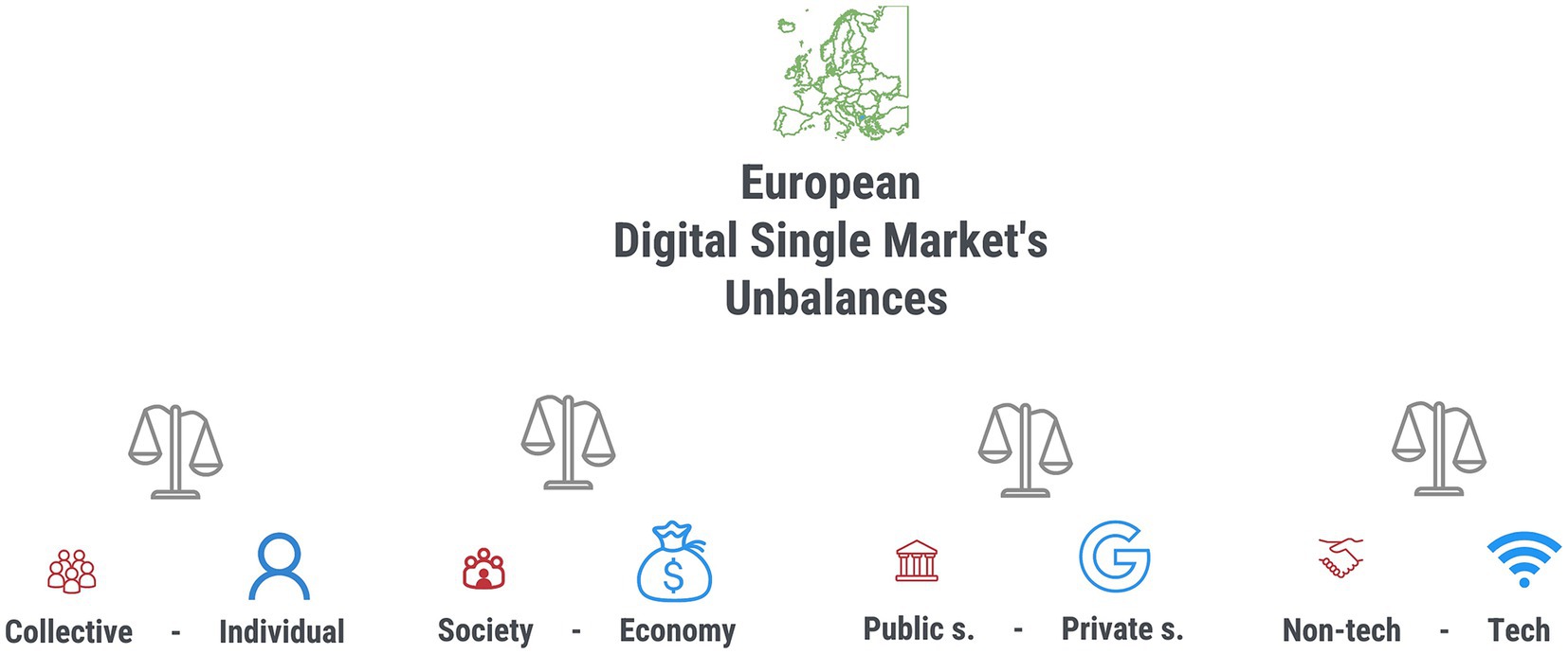 When it comes to governing the digital transformation, the European Union’s (EU) digital strategy aims to pursue a “people-centric” approach. This approach remains quite fuzzy in its characterization across documents, but in principle, it aims to safeguard human and data subjects’ rights while balancing economic competitiveness with social inclusiveness, digital sovereignty, and environmental sustainability (European Parliament and Council, 2016, 2019, 2020a,b, 2022a,b; cf. also European Commission, 2022b). As such, the EU’s “people-centric” approach emphasizes both the individual and collective dimensions of the digital transformation—or what we call a “collectual” (collective + individual) equilibrium—insofar as “people-centric” is concerned as much with the rights of the individual as with principles pertaining to society as a whole.