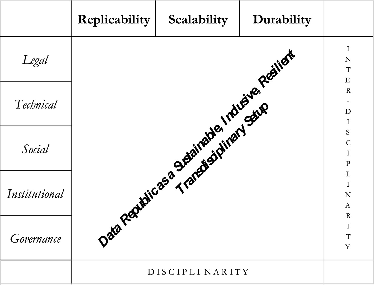 By combining structural limits and substantial barriers, we obtain a Figure 3 that can be explored both disciplinarily—i.e., following the rows—and interdisciplinary—i.e., following the columns. By crossing the two axes, it becomes possible to transdisciplinarily explore the enactment of socio-economically sustainable, inclusive, and resilient digital initiatives. Just as an example, governance row might concretize in the exploration of issues, such as (1) the design of a public single contact point to which citizens can relate for data-related enquiries (as far as replicability is concerned); (2) stewardship processes to link top-down and bottom-up actors and data initiatives (as far as scalability is concerned); (3) the sustainable conditions enabling a public-private synergy for the pooling and sharing of data beyond emergency situations only (as far as durability is concerned). Each of these issues, then, shall be explored conjointly from different disciplinary angles—i.e., institutional, social, technical, and legal—along the replicable, scalable and durable columns, so that, in the end, the sustainability, inclusiveness and resilience of each issue addressed (each box) emerges out of the analysis, rather than being imposed upfront.