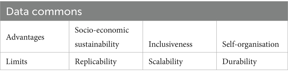 Over the last decade, various initiatives (cf. Morozov and Bria, 2018; de Lange and de Waal, 2019; The New Hanse Project, 2023) have emerged around Europe enacting a commons-inspired approach to data and digital infrastructures. These initiatives do provide evidence of successful data-commoning practices that tackle the creation of social and economic value conjointly while promoting inclusiveness and self-organization. At the same time, however, these initiatives betray three major structural limits (Table 1 below summarizes the advantages and limits of data commons initiatives):