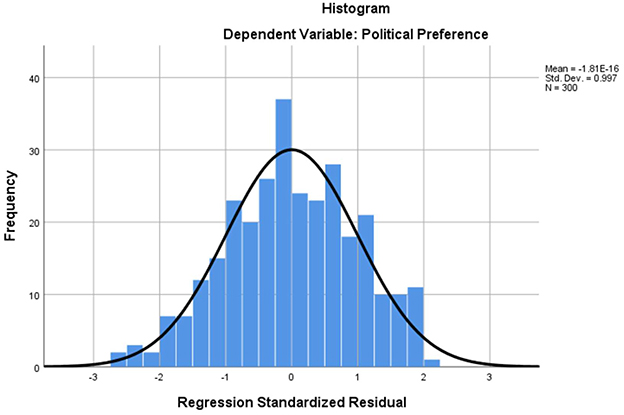 Based on Figure 3, the residual distribution is close to a symmetrical bell shape. Most of the residual values are around zero and decrease gradually to the left and right. There are no extreme deviations (e.g., distribution spikes on one side or very skewed). The mean residual = 2.82E−16 (≈0) and standard deviation = 0.997, indicating that the residuals are well distributed and close to a normal distribution. Therefore, it can be concluded that this histogram indicates that the assumption of residual normality is met, which is one of the important prerequisites in classical linear regression analysis (OLS). With this assumption met, the previously interpreted regression results (F-test, t-test, R2) can be considered statistically valid. This figure illustrates the residual distribution of the regression model used to predict political preferences. The distribution resembles a symmetrical bell-shaped curve, with residual values primarily centered around zero and gradually tapering off on both sides. There are no significant deviations, which indicates that the assumption of normality for the residuals has been satisfied. This finding supports the validity of the regression analysis results.