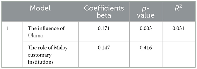 Table 1. Results for multiple linear regression: influence of religious scholars and Malay customary institutions on political preferences.