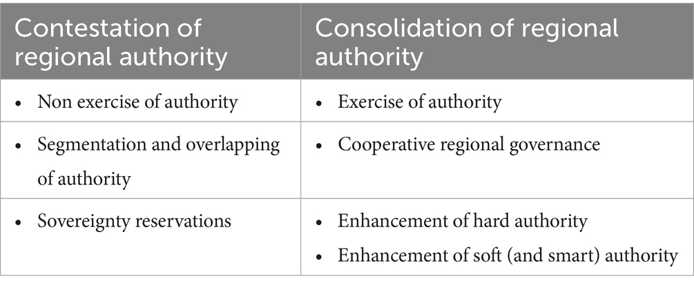 Thirdly, there is the contestation of political authority within regional organizations by individual member countries/governments. According to the IAD project “States’ principled recognition of IO authority expresses itself in two ways: in the creation of, accession to, and continued operation of IOs; and, in that states endow them with specific competences to perform a set of policy functions in their stead” (Zürn et al., 2021, 432). Hence the authority of a regional organization becomes contested by governments in different ways, when they (1) withdraw from the regional organization (accession and continuity), as in the case of the withdrawal of Venezuela and Nicaragua from the OAS, (2) block its decision-making processes (operation), (3) reduce the policy functions (or policy portfolio; Hooghe et al., 2017) endowed to the regional organization, (4) undermine the bindingness of its rules and decisions, and (5) more general by deinstitutionalizing (Brosig and Karlsrud, 2024) and informalizing the regional organization through the bypassing of established rules of procedure and circumventing institutionalized forms of action (a topic that is central to the concept of liquid regionalism).