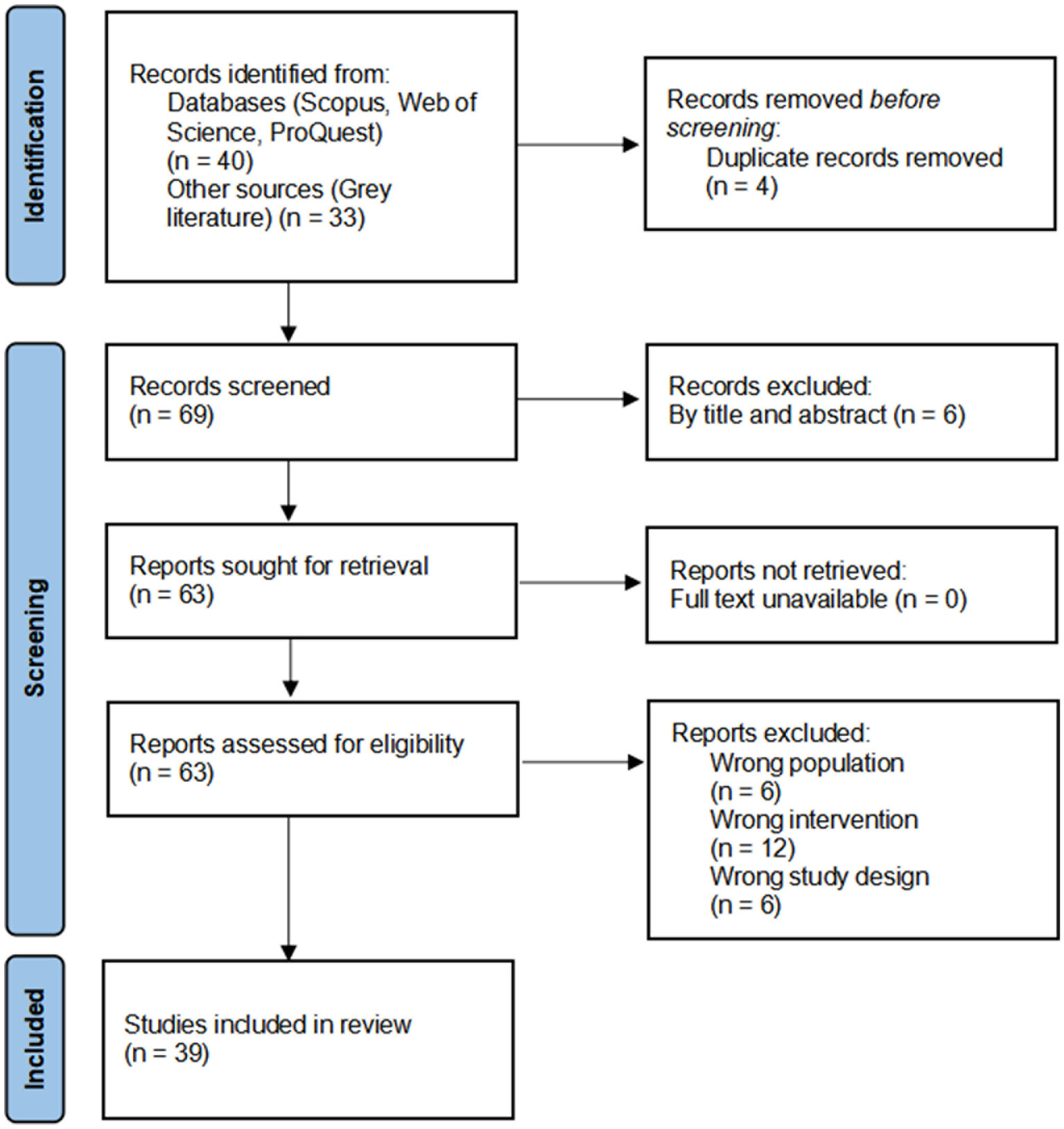 The selection process followed the PRISMA 2020 guidelines, as illustrated in the flow diagram (Figure 1). The initial search yielded 73 records from academic databases (n = 40) and grey literature (n = 33). After removing 4 duplicate records, 69 unique records were advanced to the screening phase.