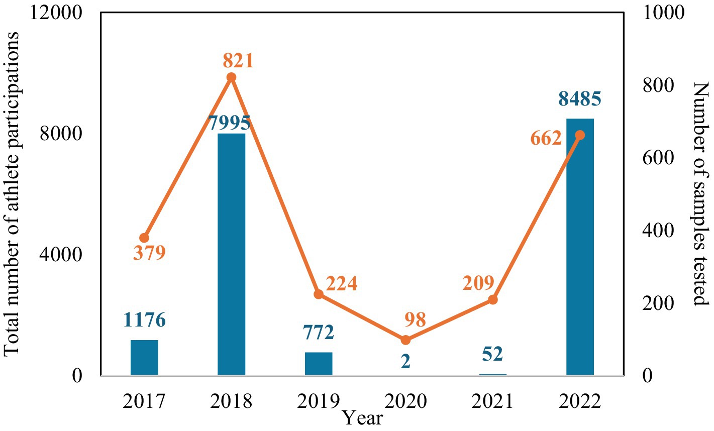 Figure 2. Comparison of Malaysian athlete participation in high-priority national and international sports events with total anti-doping samples tested (2017–2022). This figure visually contrasts the annual number of anti-doping samples collected from Table 2 with the estimated number of athletes participating in major events from Table 3.