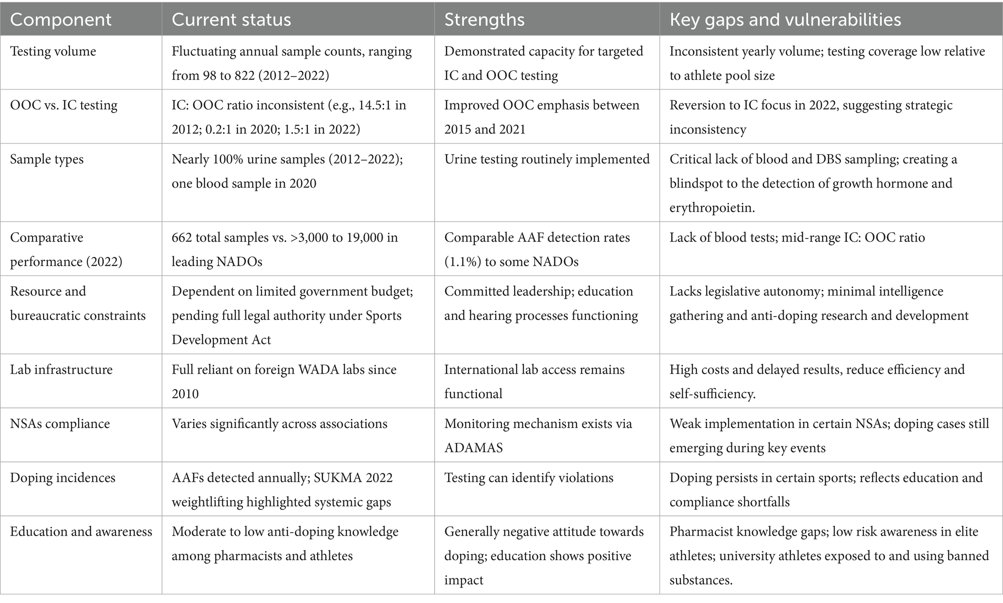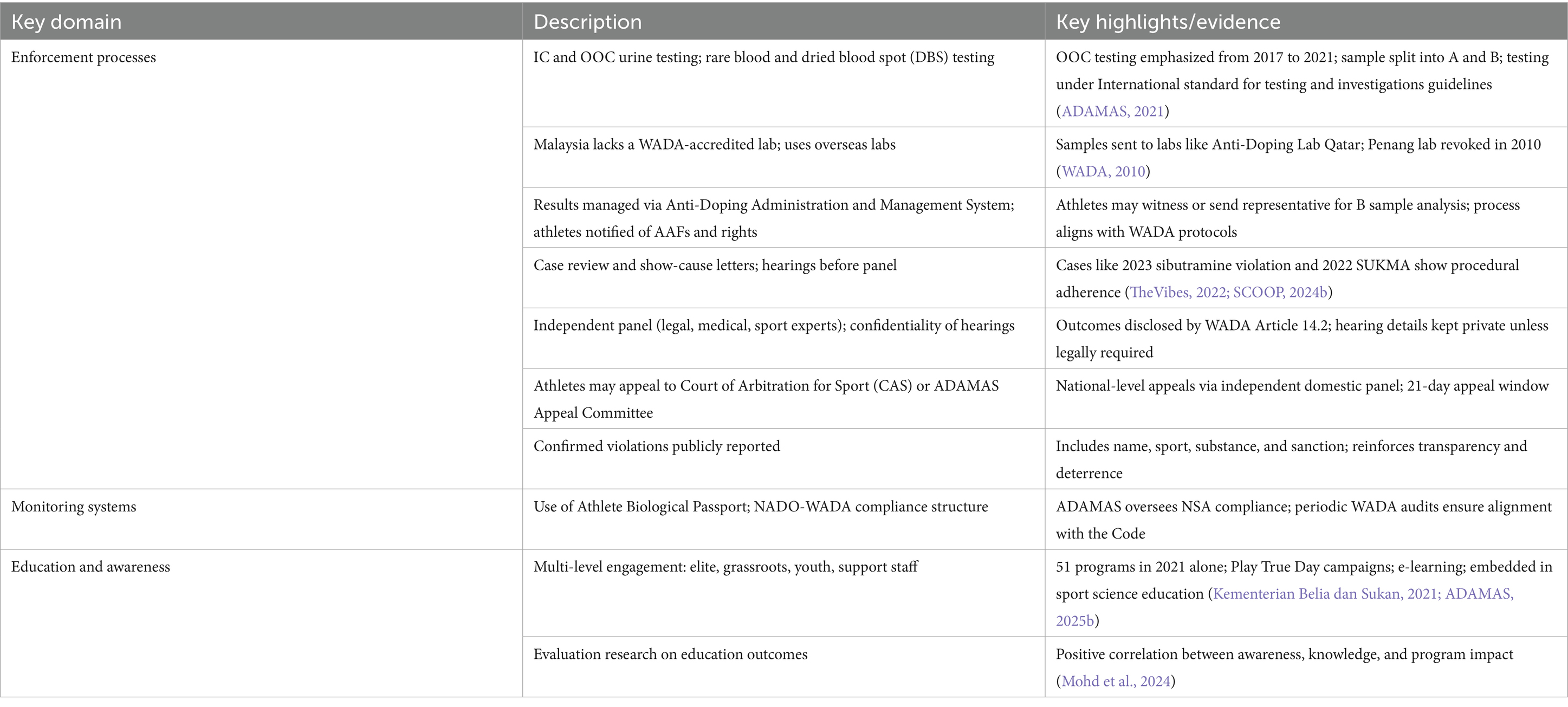 A summary of Malaysia’s core anti-doping functions is presented in Table 1, which outlines the key features of its enforcement processes, monitoring systems, and education and awareness initiatives.