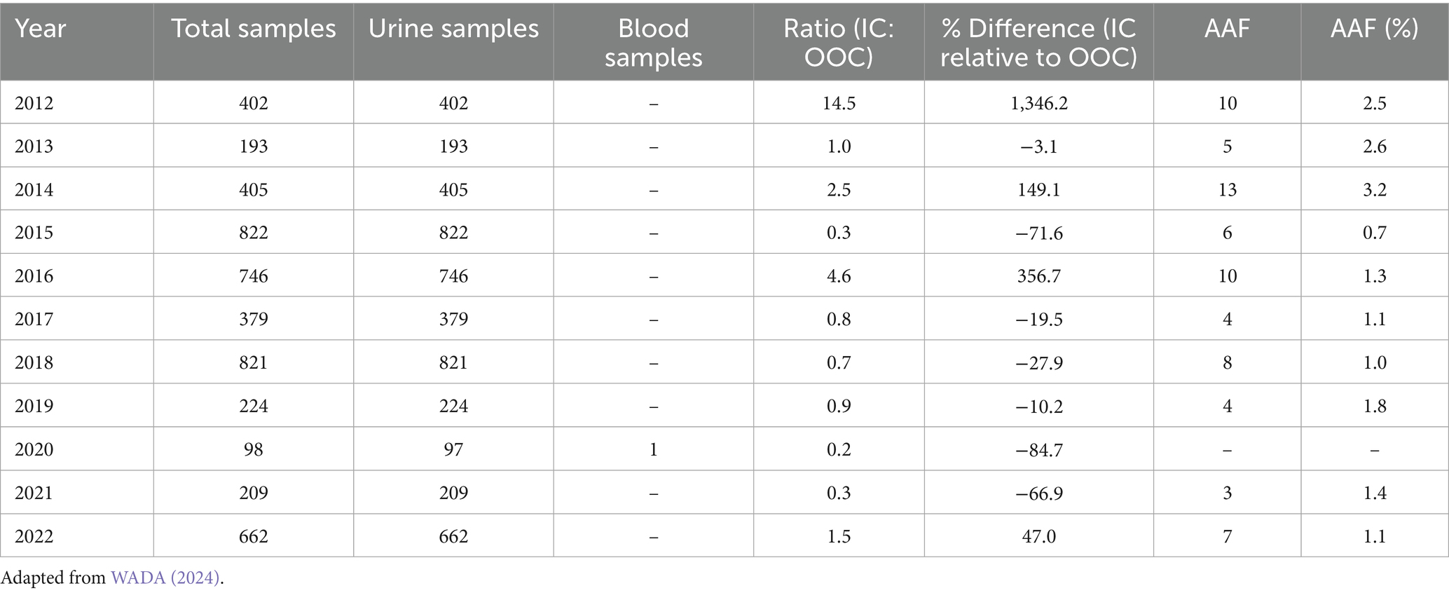 WADA. (2024). 2022 anti-doping testing figures. Available online at: https://www.wada-ama.org/sites/default/files/2024-04/2022_anti-doping_testing_figures_en.pdf (Accessed 20 November, 2024).