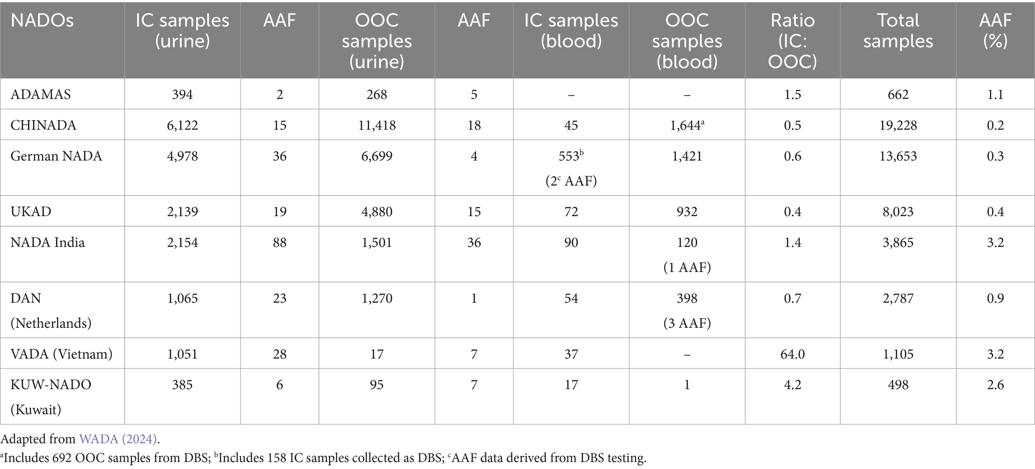 AAF, Adverse analytical finding; ADAMAS, Anti-doping agency of Malaysia; CAS, Court of Arbitration for Sport; DBS, Dried blood spot; IC, In-competition; NADO, National Anti-Doping Organization; NSA, National Sports Associations; OOC, Out-of-competition.