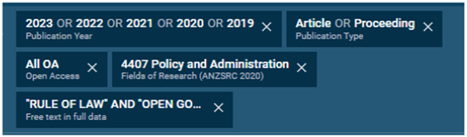 Bibliographic data were collected from three academic databases—Scopus, Dimensions, and Google Scholar—to ensure comprehensive coverage of governance, public administration, and legal scholarship. Searches were conducted on January 12, 2025 (Scopus and Dimensions) and January 13, 2025 (Google Scholar) to account for platform-specific indexing updates. Only records published between 2014 and 2023 were considered, reflecting the period following the global diffusion of open government initiatives. To ensure conceptual consistency while accommodating, the following queries were applied;