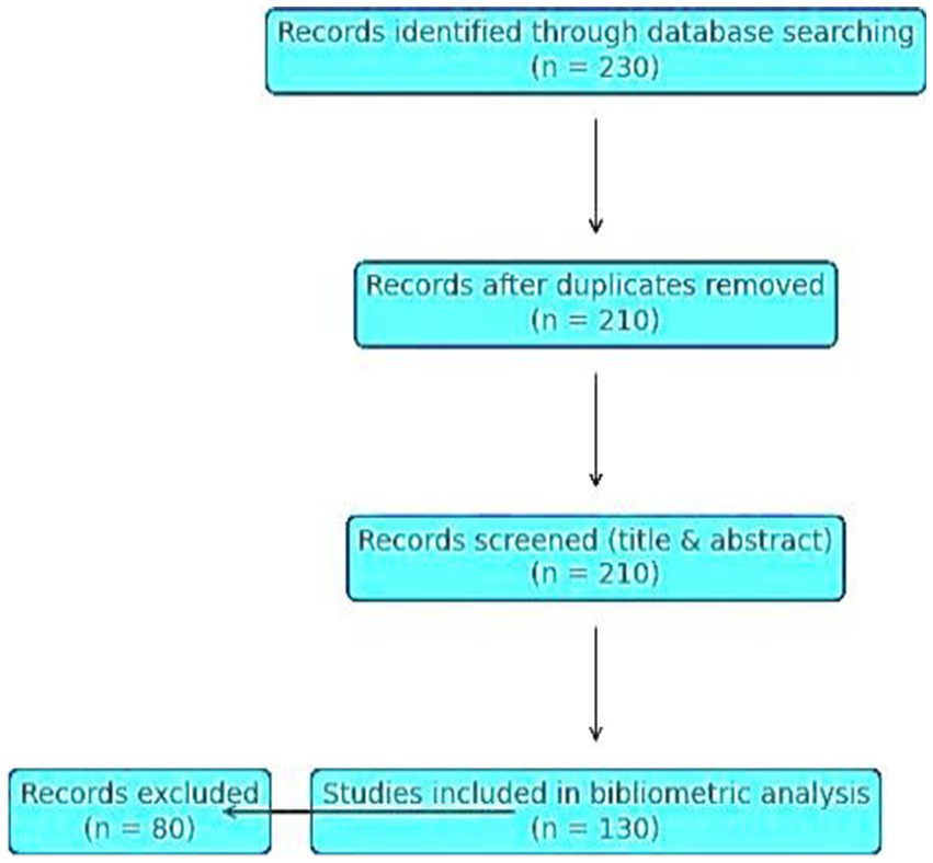 The literature selection followed a PRISMA-style workflow adapted for bibliometric analysis. An initial total of 230 records were identified across the three databases. After removing duplicates (n = 20), 210 unique records remained and were screened based on titles and abstracts. Following relevance screening and metadata completeness checks, 130 records were retained for final bibliometric and scientometric analysis. This process is visually summarized in Figure 2.