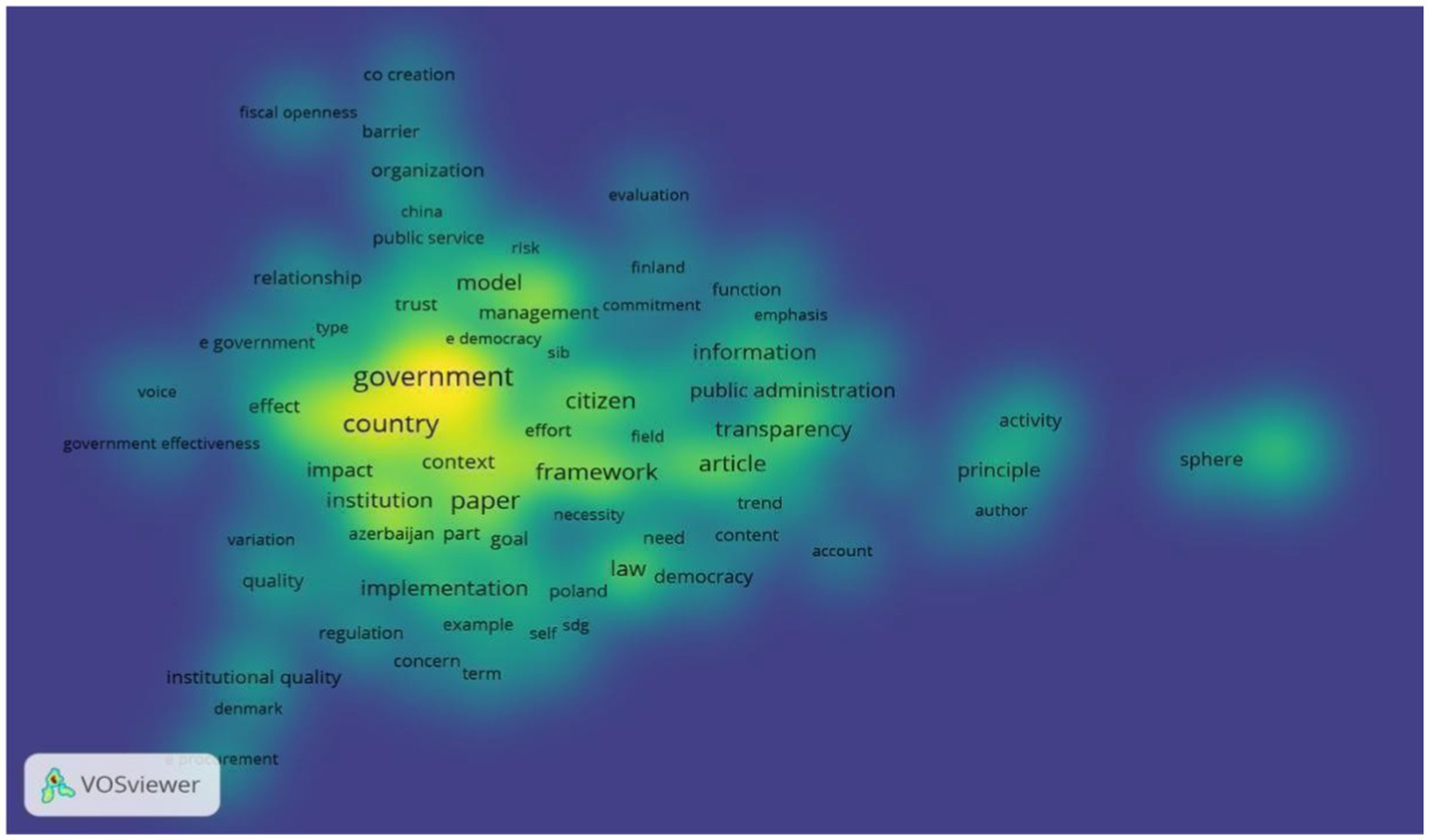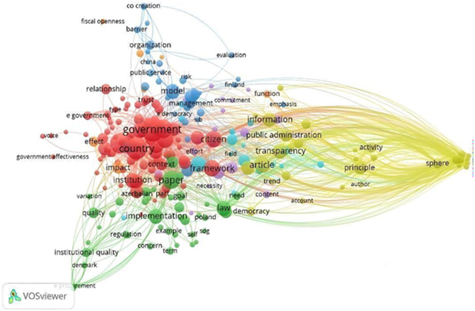 Bibliometric patterns reveal that the core concepts underpinning this relationship— government, transparency, public administration, and public participation—form tightly connected thematic clusters in global research trends. These clusters underscore that implementing rule-of-law principles through open government requires an integrated governance ecosystem in which legal structures, administrative processes, and citizen engagement operate in synergy.