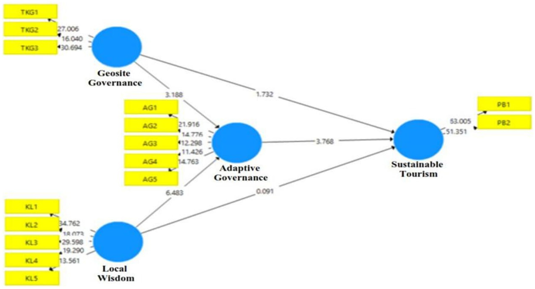 The results of the convergent validity test indicate that all indicators in each construct have outer loading values above 0.70, thus meeting the indicator validity criteria (Hair et al., 2019). The Adaptive Governance construct is represented by five indicators (AG1–AG5) with loadings between 0.740–0.836. This indicates that all indicators have a fairly strong contribution in explaining the concept of adaptive governance. The Local Wisdom construct (KL1–KL5) has an outer loading of 0.801–0.866 with an AVE value of 0.708, meaning it is able to explain more than 70% of the indicator variance. Sustainable Tourism also shows high reliability with two main indicators (PB1 and PB2) having outer loadings above 0.930 and an AVE of 0.872, indicating very strong indicator consistency. Meanwhile, Geosite Governance has three indicators (TKG1–TKG3) with loadings of 0.814–0.881, a Cronbach’s Alpha of 0.818, and an AVE of 0.733, which means it meets construct validity standards. In terms of reliability, all constructs have a Cronbach’s Alpha > 0.70, Composite Reliability > 0.70, and AVE > 0.50. This proves that the research model has excellent internal consistency and adequate convergent validity (Gutiérrez Navas et al., 2024; Hair et al., 2019). Thus, all constructs in this study can be declared reliable and valid for further analysis in testing the structural model (Figure 4).