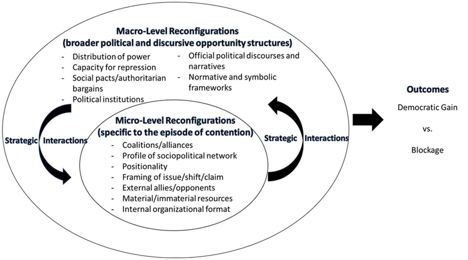 In conceiving popular uprisings and their aftermath, before the political order fully settles, as processes of multisectoral mobilization, our theoretical argument puts forth a concept of reconfigurations in institutional, relational, and discursive-symbolic terms. This concept draws from Ouaissa et al. (2021), in which reconfigurations are understood as dynamic change processes in political, economic, social, and cultural relations during and in the aftermath of uprisings. We argue that reconfigurations create possibilities for action/interaction that can be conflictual and/or cooperative, acting thus as the conditions that lead to either political openings or blockages. The reconfigurations, hence, act as both structures but are also shaped/re-shaped by interactions, implying a relational ontology. In this way, reconfigurations can both enable and block political change, acting as conditions underlying episodes of contentious politics that are not static but rather shaped and reshaped by strategic interactions. In this way, our approach (Figure 1) posits that the institutional, relational, and discursive fluidity of popular uprisings produce conditions for small-scale democratic advancement and set-back that must be placed in a longer-term and wider perspective in the evaluation of political outcomes.