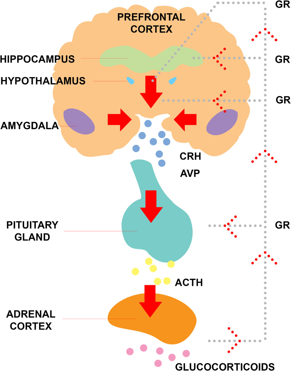 Figure 2. Functioning of the hypothalamic–pituitary–adrenal axis. Abbreviations: GR, glucocorticoid receptor; ACTH, adrenocorticotropic hormone; CRH, corticotropin-releasing hormone; AVP, arginine vasopressin.