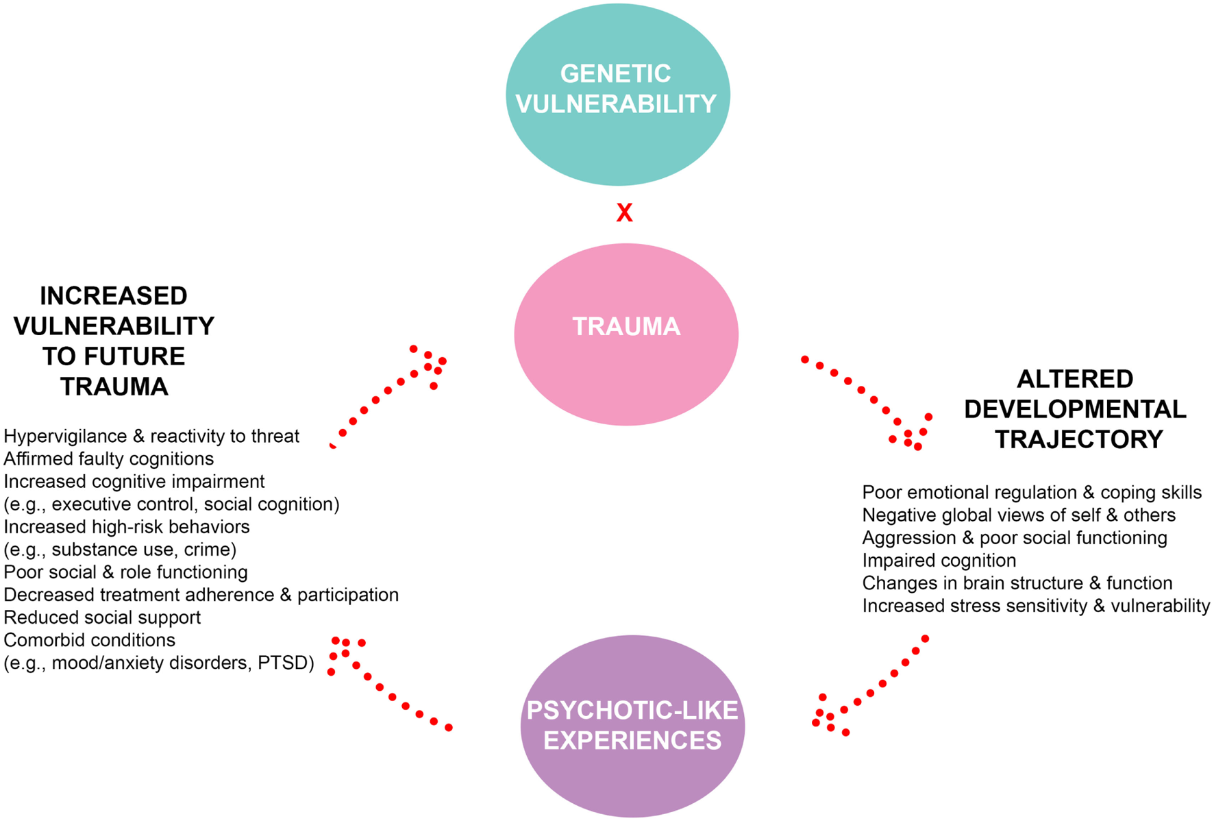 Multiple models have been cited to explain the link between trauma and later psychosis, including the stress-vulnerability and stress-sensitivity hypotheses, with emphases on both cognitive processes and neurobiological mechanisms (e.g., the hypothalamic–pituitary–adrenal axis). Consistent with a gene–environment interaction model, trauma history appears to contribute to psychosis in adulthood somewhat independent of genetics (109). A recent gene–environment interaction study supports the idea that genes associated with schizophrenia lead to changes in not only dopamine but also serotonin signaling pathways in the brain, thus suggesting an “affective pathway” to psychosis (110). Below, we address models that have been referenced in previous works to explain the potential interplay between trauma, stress, and psychosis. Following the discussion of currently identified relationship models of trauma and psychosis, we propose our own comprehensive model that conceptualizes a cyclical relationship between trauma and psychosis risk.