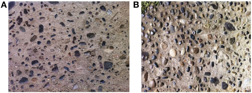 Figure 2. Sidewalks with surface patterns which triggered phobic reactions according to the patient’s mother. (A) Sidewalk with stones in the concrete yielding little phobic reaction. (B) Sidewalk with stones in the concrete that caused high phobic reaction with neurovegetative symptoms.