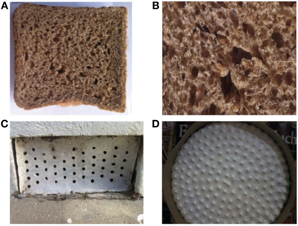 Figure 3. Objects with surface patterns which triggered phobic reactions according to the patient’s mother: (A,B) holes in a slice of bread, (C) pattern of holes in a piece of metal, (D) Sharp spikes on the meringue frosting of a pie.