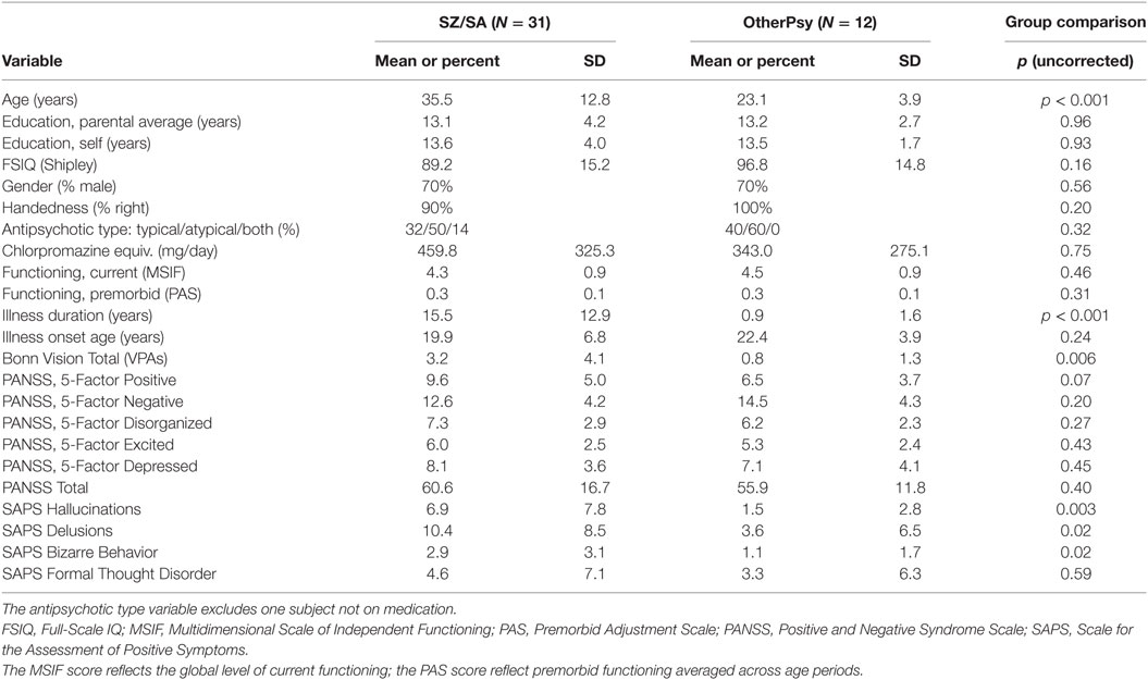 Method: Using the 17 Bonn Scale vision items, we cross-sectionally investigated lifetime occurrence of VPAs in 21 first-episode psychosis and 22 chronic schizophrenia/schizoaffective disorder (SZ/SA) patients. Relationships were probed between VPAs and illness duration, symptom severity, current functioning, premorbid functioning, diagnosis, and age of onset.