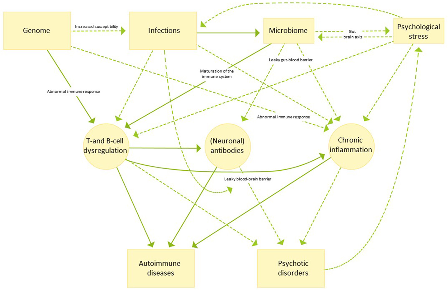Figure 1. An illustrative overview of possible etiological mechanisms linking autoimmune disease and psychotic disorders. Continuous arrows indicate pathways for which evidence is strong, while dotted arrows indicate pathways which are currently not well understood or more speculative in nature.