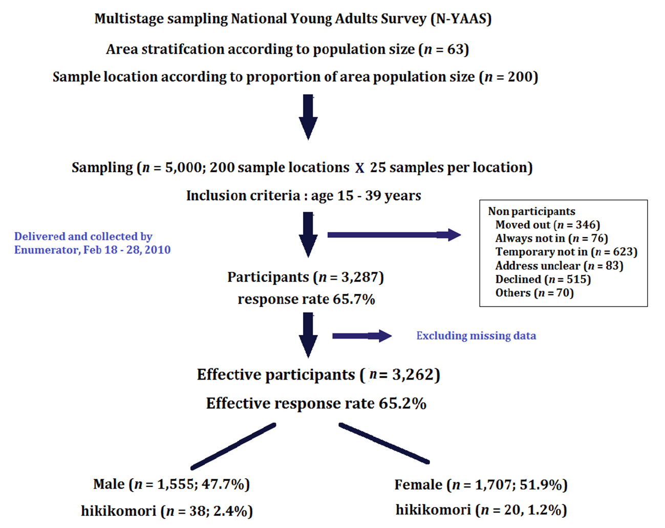A total sample size of 5,000 was estimated for the population of 15–39-year-olds. Multistage stratified randomized sampling was used to ensure that the samples represented all areas in Japan. Firstly, 200 locations were randomly selected from 198 municipalities stratified by area and population size. Secondly, in each location, 25 samples were randomly selected from the municipality registration list. A set of self-administered questionnaires was distributed and collected by hand between February 18 and February 28, 2010. The response rate was high (65.7%): 3,287 participants responded to the study and, after excluding missing data, 3,262 samples were effective for analysis (Figure 1).