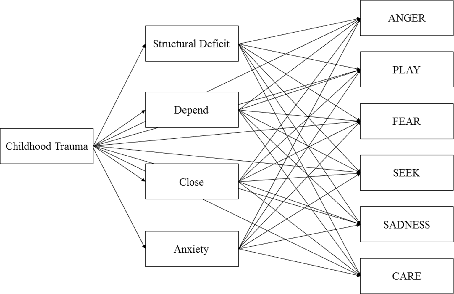This procedure yielded a model that fit the data well: RMSEA = 0.00 (90% CI: 0.00, 0.05); TLI = 1.00; CFI = 1.00; BIC = 535.63. In a further step, the model was pruned by removing nonsignificant paths. First, nonsignificant paths from Childhood Trauma to primary emotions were deleted. This included every association between Childhood Trauma and primary emotions. Second, nonsignificant paths from Structural Deficit and attachment dimensions to primary emotions were removed. This included (1) paths from Structural Deficit to SADNESS, FEAR, CARE, and SEEK; (2) paths from Close to FEAR, SADNESS, and ANGER; and (3) paths from Anxiety to ANGER, SEEK, and PLAY.