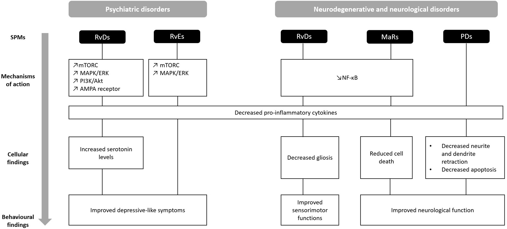 This review summarizes evidence on the beneficial effects of resolvins, protectins and maresins, in the treatment of psychiatric, neurodegenerative, and neurological disorders (Figure 2). Overall, treatment with both RvD and RvE improved depressive-like behaviors in various animal models of depression, whereas PD1 and MaR1 ameliorated neurological function. On a cellular level, RvD1 and RvD2 increased serotonin levels in a model of depression, and decreased gliosis in neurodegenerative disorders. In contrast, PD1 and PDX prevented neurite and dendrite retraction and apoptosis in models of neurodegeneration, while MaR1 reduced cell death across all studies. In terms of mechanisms, all SPMs down-regulated pro-inflammatory cytokines, such as IL-1β, IL-6, and TNF-α. RvD1, RvD2, and RvE1 exerted their effects through mTOR and MAP/ERK signaling in models of depression, while RvD1, RvD2, and MaR1 through the NF-κB pathway in models of neurodegeneration and neurological disorders. These findings suggest that not only do SPMs have anti-inflammatory properties across different models, but also possess characteristic therapeutic effects depending on the condition.