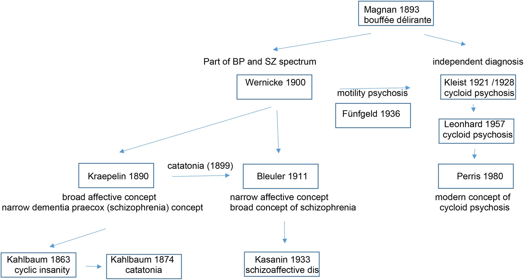 Table 2 depicts the evolution of the cycloid psychosis as a psychiatric diagnosis and its relation to other entities of the affective and schizophrenic spectrum.
