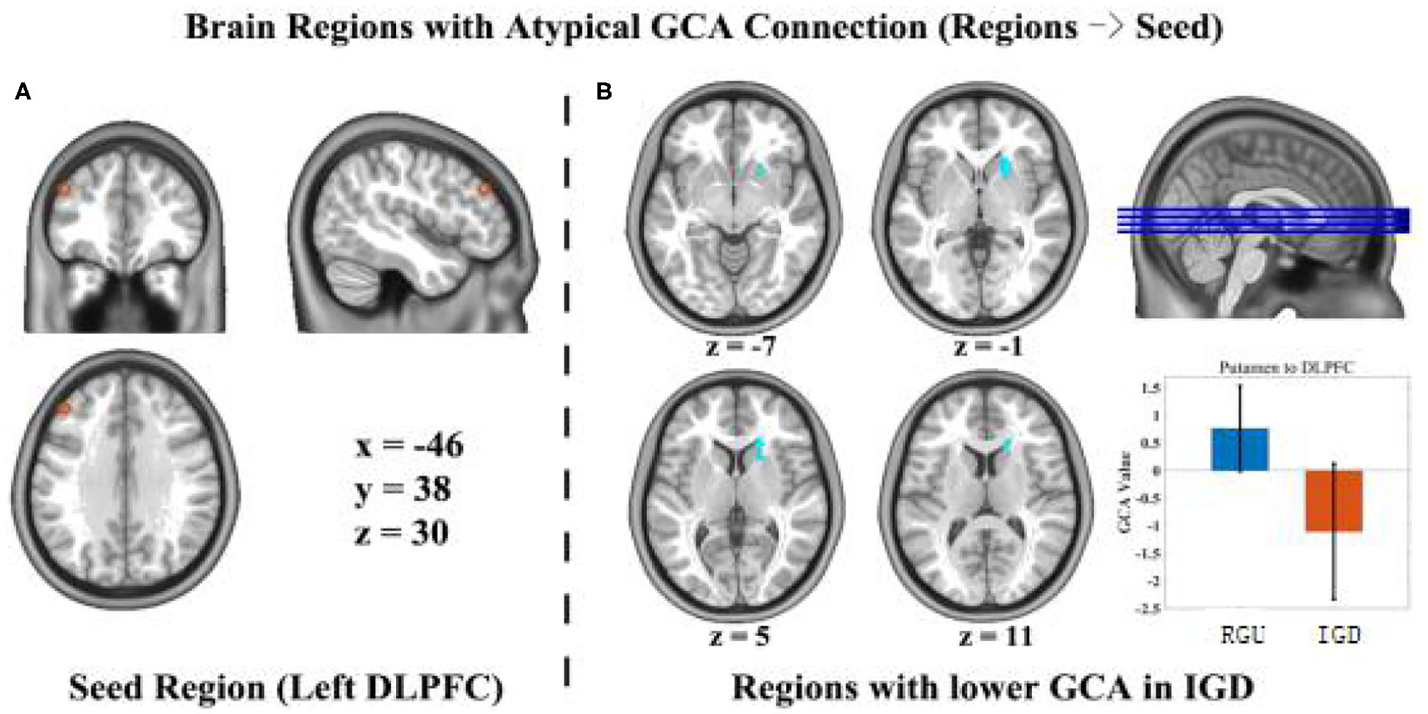 Differences in GCA results between the IGD group and RGU group during resting state. p < 0.05 (AlphaSim correction). Voxel size = 3 × 3 × 3 mm3, the orange circle is the seed point of the DLPFC left-brain position (A). The blue circle represents an efficient connection with the seed point to abnormal brain areas (B).
