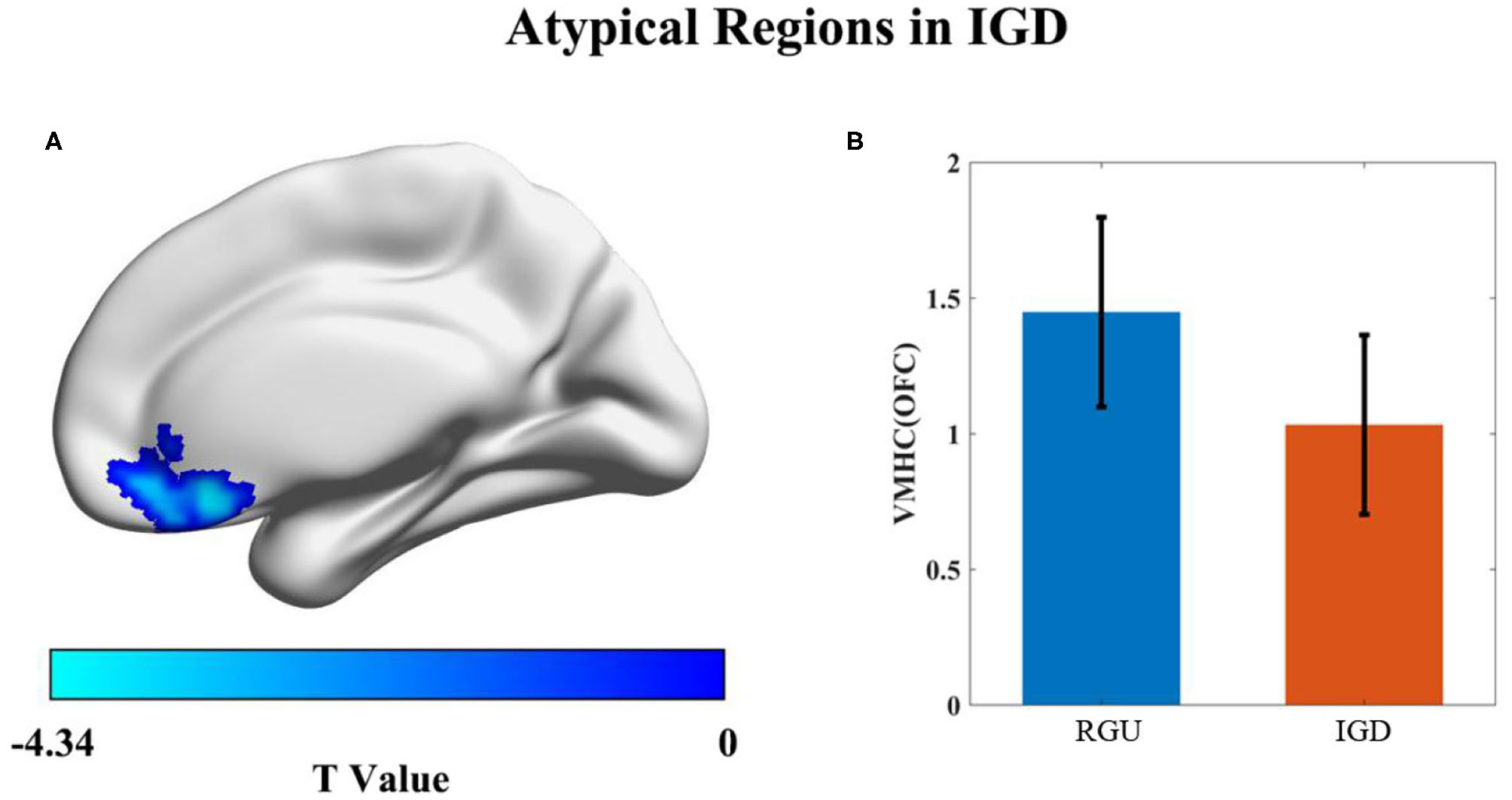 Differences in VMHC value between the IGD and RGU groups durinresting state. p < 0.05 (AlphaSim correction). Voxel size = 3 × 3 × 3 mm3, the blue color represents the VMHC decreased area in the IGD group compared with the RGU group (A). Histogram (B) shows the mean and standard deviation of VMHC values in the two groups.