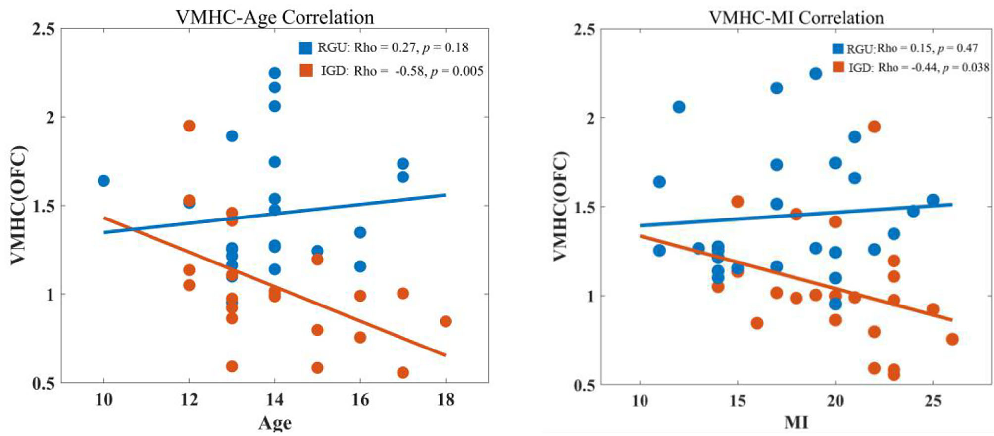 VMHC values in abnormal brain areas of the two groups were extracted, and it was found that VMHC values in the IGD group were negatively correlated with age (r = −0.58, p < 0.05). The RGU group did not exhibit this tendency (r = 0.27, p > 0.05). The correlation between the two groups was significantly different. The VMHC value of IGD patients was negatively correlated with MI (r = −0.44, p < 0.05; Figure 3).