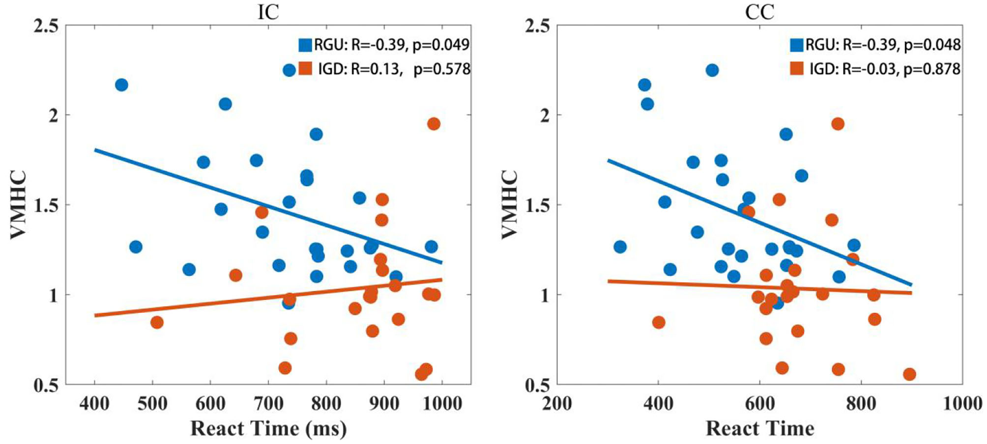 VMHC values in abnormal brain areas of the two groups were extracted, and it was found that VMHC values in the RGU group were negatively correlated with RT on IC conditions (r = −0.39, p < 0.05). The IGD group did not have this tendency (r = 0.13, p > 0.05). Under CC condition, VMHC value in RGU group was negatively correlated with RT (r = −0.39, p < 0.05). The IGD group did not have this tendency (r = −0.03, p > 0.05; Figure 4).