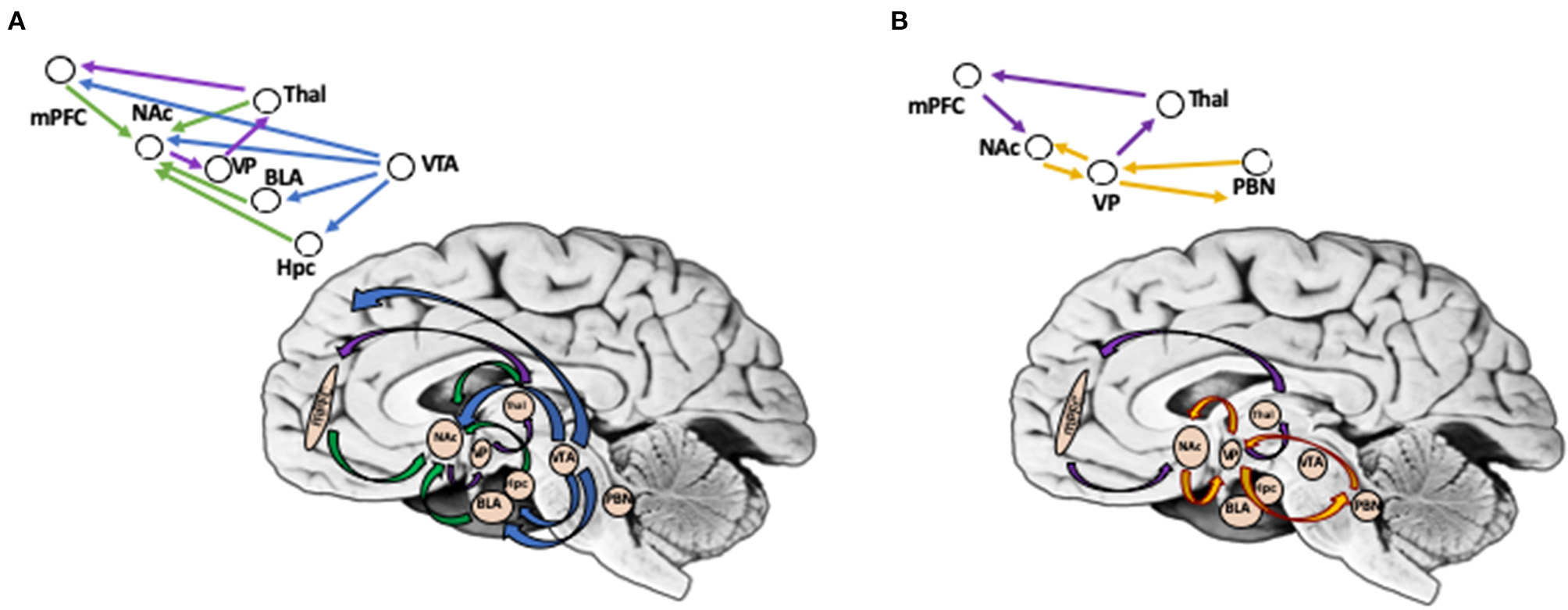 (A) Brain Circuits Involved in Reward Wanting (Anticipation). Reward wanting include mesolimbic and mesocortical dopamine pathways (shown in blue). DA neurons in ventral tegmental area (VTA) target nucleus accumbens (Nac), basolateral amygdala, and hippocampus in mesolimbic pathway, and cortical regions (mPFC) in mesocortical pathway. In addition, glutamate afferents convey signals to the NAc from mPFC, basolateral amygdala, hippocampus, and thalamus (shown in green). NAc projects via ventral pallidum (VP), to thalamic nuclei, that projects to prefrontal cortex, thus completing cortico-striato-pallidal-thalamic loops (shown in purple). (B) Brain Circuits Involved in Reward Liking (Outcome). Reward liking link together “opiod hotspots,” one of them being in the nucleus accumbens (Nac) shell, while another in posterior part of ventral pallidum (VP) (shown in yellow). It has been proposed that liking may be sub-served by a hierarchical circuit that in addition to NAc and VP includes areas in the forebrain, such as parabrachial nucleus, as well as in brainstem. Cortico-striato-pallidal-thalamic loops include projections from mPFC to NAc; NAc in turn projects via VP, to thalamic nuclei, which then targets mPFC (shown in purple). PFC, prefrontal cortex; NAc, nucleus accumbens; VP, ventral pallidum; VTA, ventral tegmental area; BLA, basolateral amygdala; Hpc, hippocampus; Thal, thalamus; PBN, parabrachial nucleus. *Background photo courtesy of Dr. Leonard E. White.