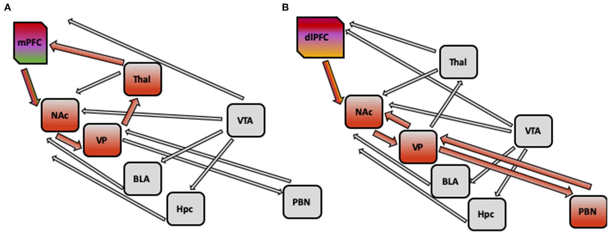 (A) Hypothetical pathway implicated in PTSD pathology: impaired context processing linked to alterations in reward processing. Impaired context processing reflected in diminished activity of medial PFC may affect the reward anticipation via altering the activity of glutamate afferents from medial PFC to nucleus accumbens (NAc), which may lead to decreased activation of NAc. Furthermore, as Nac projects to ventral pallidum, which in turn projects to prefrontal cortex via thalamic nuclei, the activity of this cortical loop may be changed. (B) Hypothetical pathway implicated in PTSD Pathology: impaired emotion regulation linked to alterations in reward processing alterations in emotion regulation (such as inability to switch attention from trauma-related cues, or diminished cognitive appraisal) reflected in decreased activation of dorsolateral PFC and dorsomedial PFC may lead to diminished positive affect with altered activity of opioid system in nucleus accumbens (NAc) and ventral pallidum (VP). Decreased activity of NAc and VP may be present, and weaker connections with areas in forebrain, such as parabrachial nucleus (PBN), could be detected. mPFC, medial prefrontal cortex; NAc, nucleus accumbens; VP, ventral pallidum; VTA, ventral tegmental area; BLA, basolateral amygdala; Hpc, hippocampus; Thal, thalamus; PBN, parabrachial nucleus.