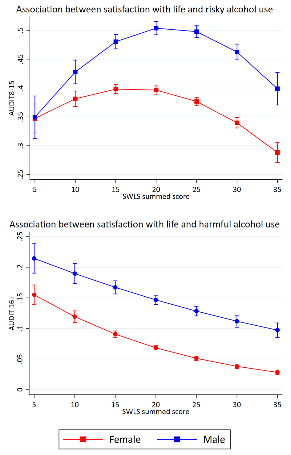 Results: Decreased satisfaction with life and increased mental health problems were associated with potential alcohol-related problems. For satisfaction with life, a curvilinear association with risky alcohol use and a linear association with harmful alcohol use was identified. For mental health problems, curvilinear associations were found for both risky and harmful alcohol use.