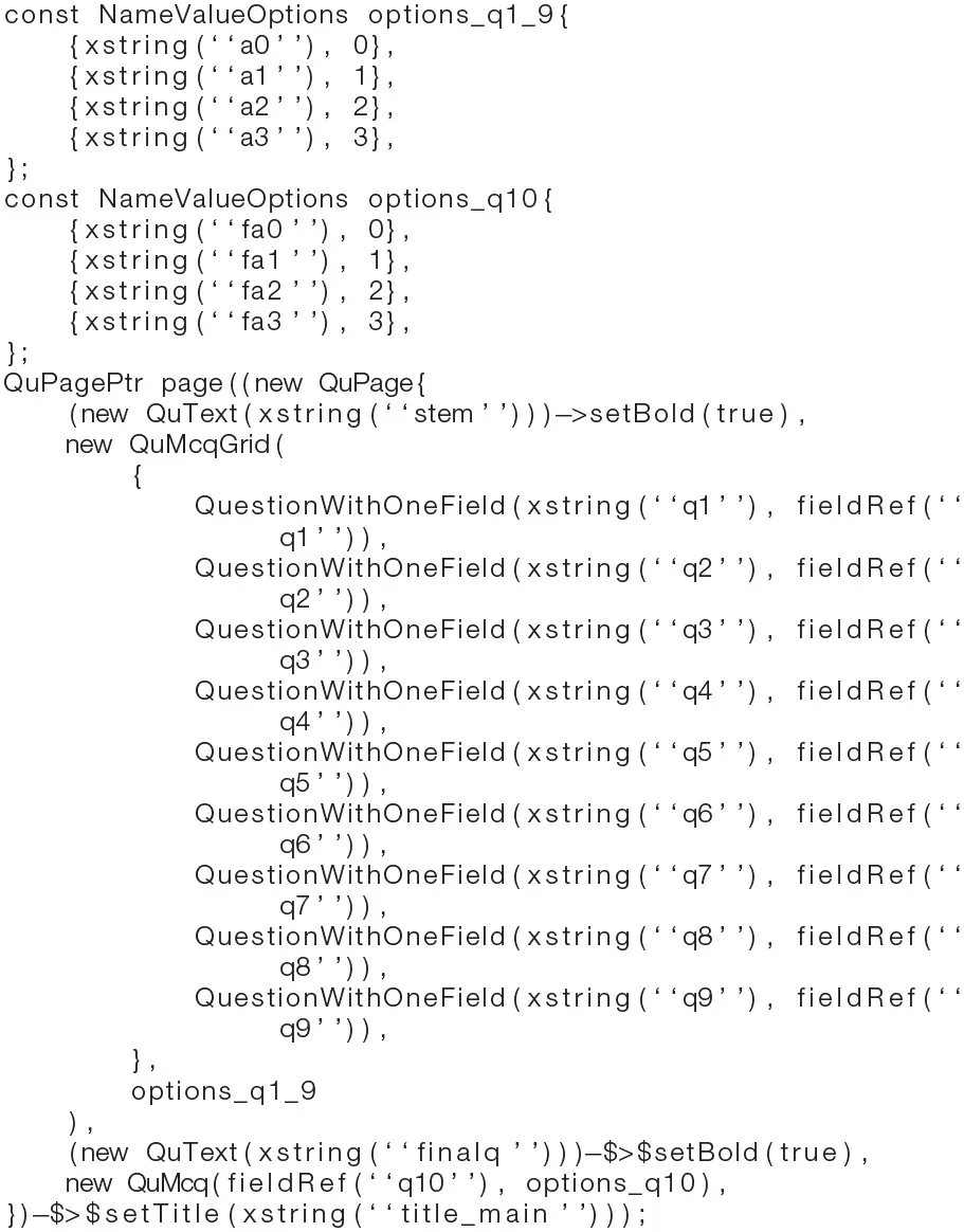 C++ code snippet illustrating the core of the implementation of a questionnaire-style task, the PHQ-9 (2), within the CamCOPS client app. This task uses some static text, a grid-style set of multiple-choice questions (MCQs) for questions 1–9 that all share a set of answers mapped to the data values 0–3, and a single MCQ for question 10. Calls to the xstring() function yield internationalized (language-/locale-specific) task strings; for example, xstring(“q1”) in the English locale evaluates to “1. Little interest or pleasure in doing things,” while xstring(“a3”) evaluates to “Nearly every day.” See Figure 3A for the resulting task.
