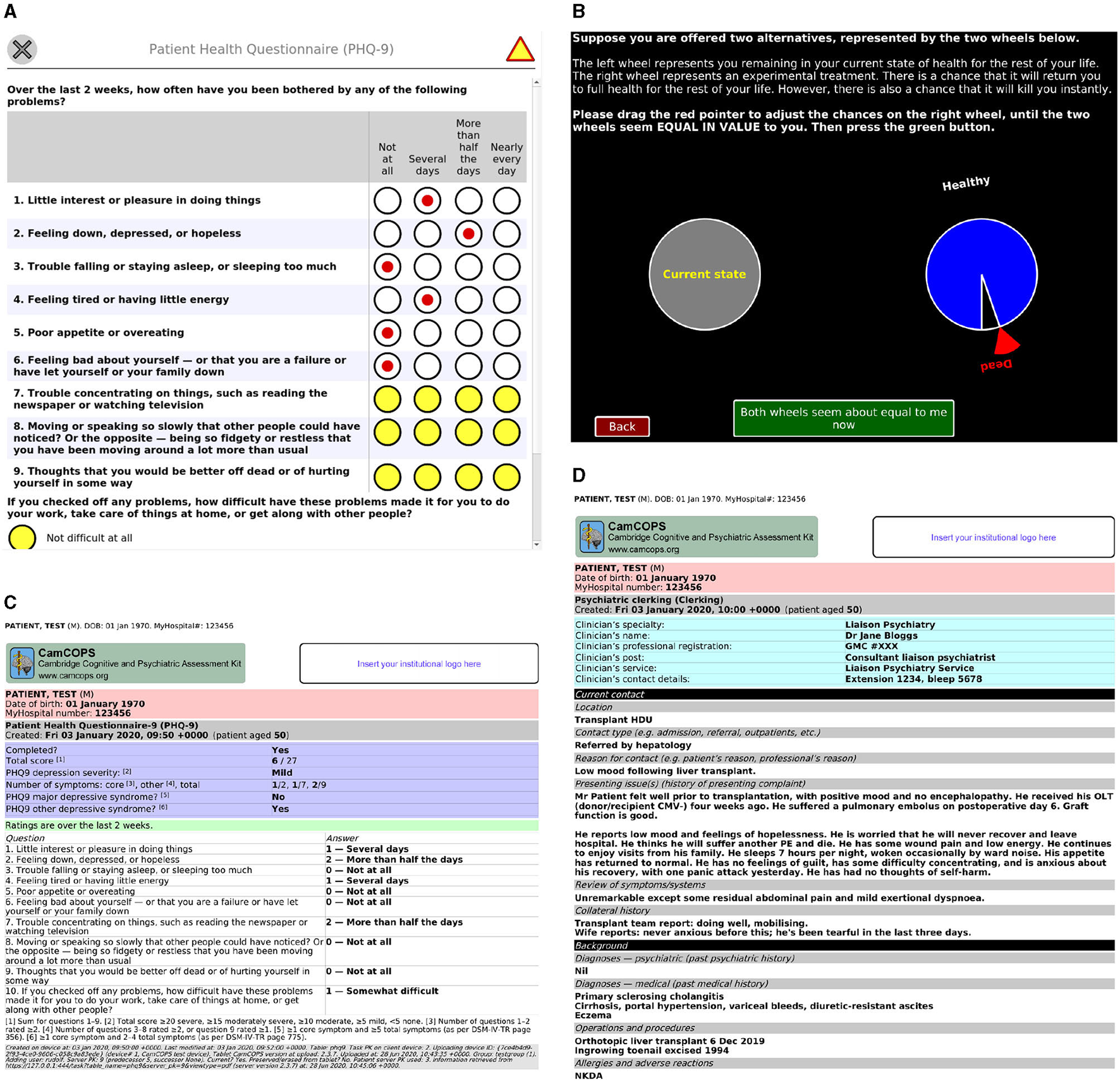 Task examples. (A) The PHQ-9 task, a simple questionnaire. Yellow is used to highlight mandatory fields that are not yet complete. (B) A simple graphical task: a quality-of-life standard gamble. (C) The PDF automatically generated by the server for the task in (A) after it was subsequently completed. (D) A server view of a task capturing text from an initial psychiatric assessment. All data are entirely fictional. CMV, cytomegalovirus; GMC, UK General Medical Council; HDU, high dependency unit; NKDA, no known drug allergies; OLT, orthotopic liver transplant; PE, pulmonary embolism.