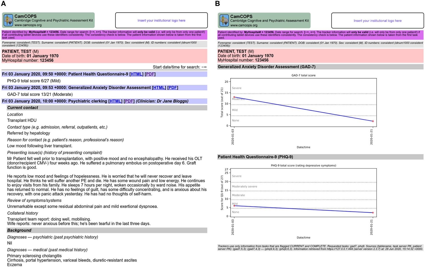 The server also provides a summary view oriented towards text, and another oriented towards numerical data (Figure 4), both available in HTML and PDF format. The clinical text view shows all tasks for a given subject, optionally constrained by date, and shows key text from each task (e.g., summary scores for cognitive assessments or mood questionnaires, or all text for clinical assessments and progress notes), with hyperlinks to the full tasks for further detail. The numerical trackers show trends in numerical information over time in graphical format (such as for mood disorder questionnaire summary scores, or body mass index [BMI]).