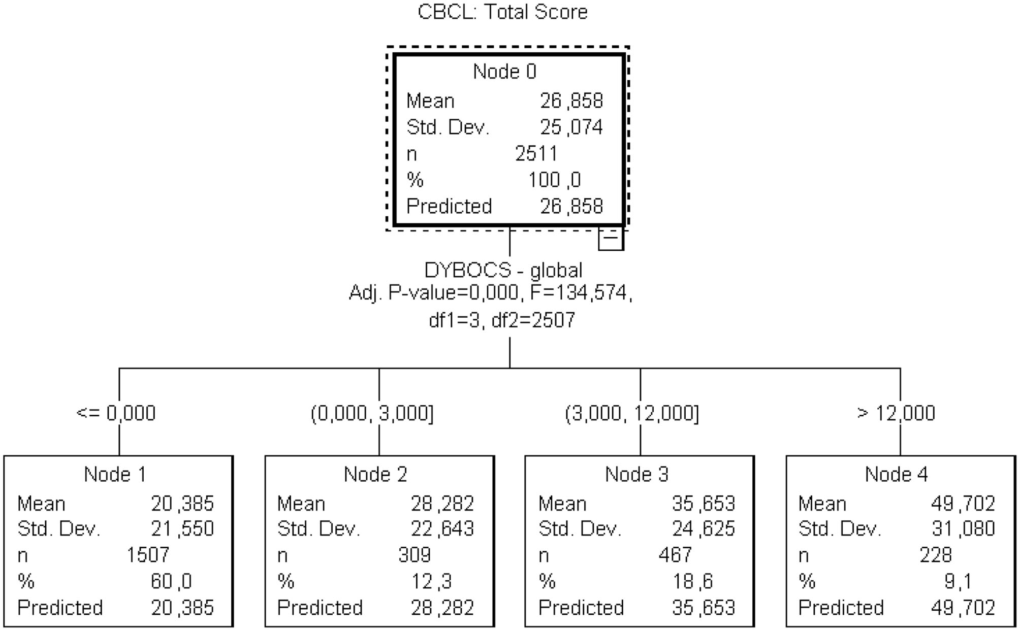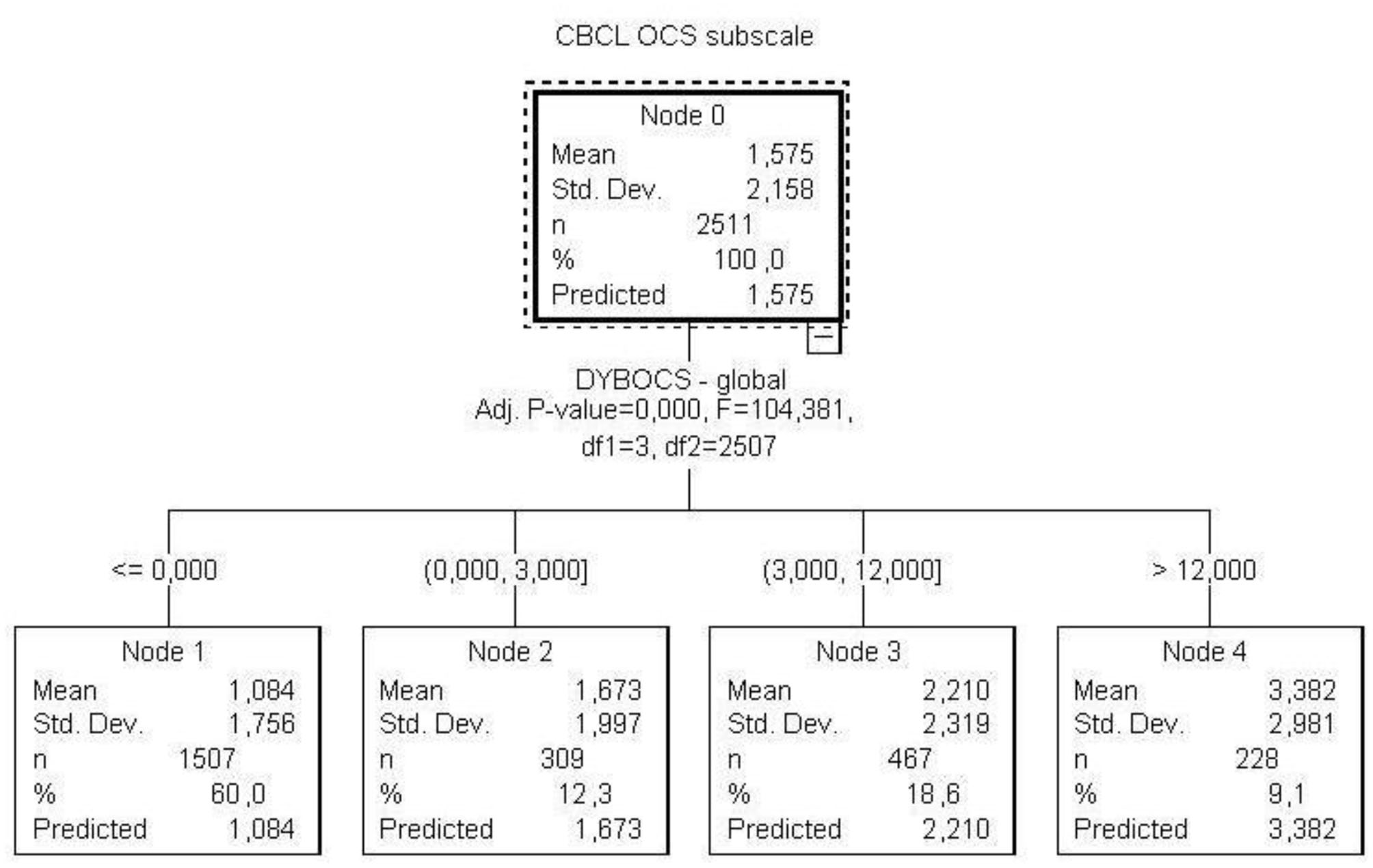 Additionally, in order to predict the risks for the children's psychopathology according to the mothers' severity of the OCS we built a decision tree. The decision trees provide a framework to quantify the values of outcomes and the probabilities of achieving them, then representing a valuable tool to reveal cutoff points to predict the risks within conditions in analysis (46).