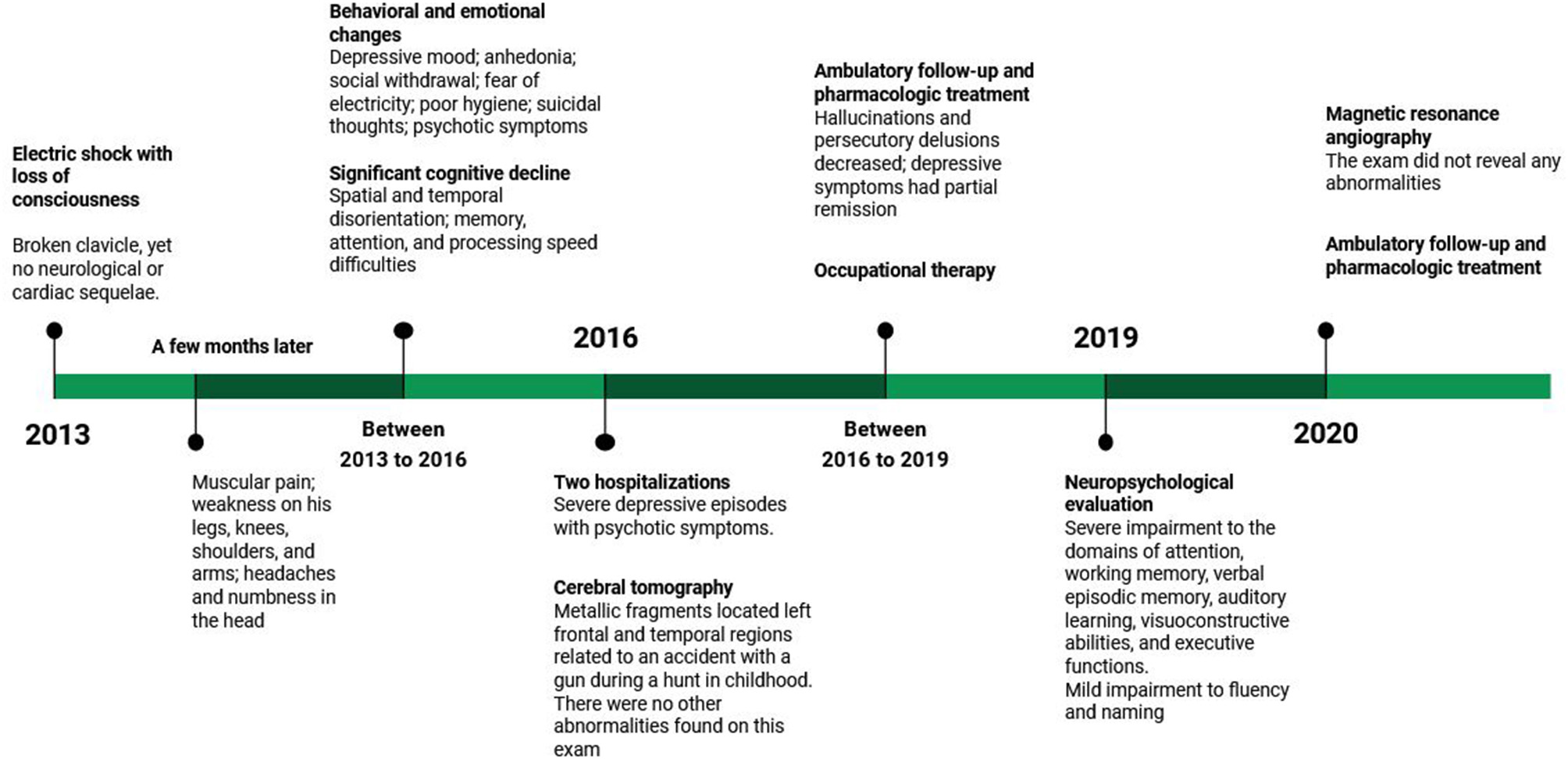 We understand that one main limitation of this study was that it was not possible to carry out more in-depth investigations using functional neuroimaging and/or genetic tests due to the financial difficulties of the patient and our service, and the impossibility to access details related to the gun accident that led to the metallic fragments in the left frontal and temporal regions, the following treatments performed at the time and cerebral tomography results. These facts add to the complexity of the case difficulty in the elimination of other possible diagnostic hypotheses, requiring a much more thorough clinical analysis. Yet, we believe that this case report is relevant, as it shares the importance of recognizing EI and its profile, especially in the Brazilian context, where we do not find studies of this type. We understand that the proper diagnosis of cases like this can lead to better management and interventions of the disease, reducing the impacts on the quality of life of the patient and his family. We argue that this condition should be considered by clinicians whenever a patient survives an accident with electric shock or lightning. However, the poor recognition of this injury may be due to the absence of official criteria for this condition in diagnostic manuals, such as the DSM-5 (4). Even though this is a very unique case, with a specific patient profile that cannot be generalized, we understand that sharing these findings can help other professionals in dealing with similar cases.
