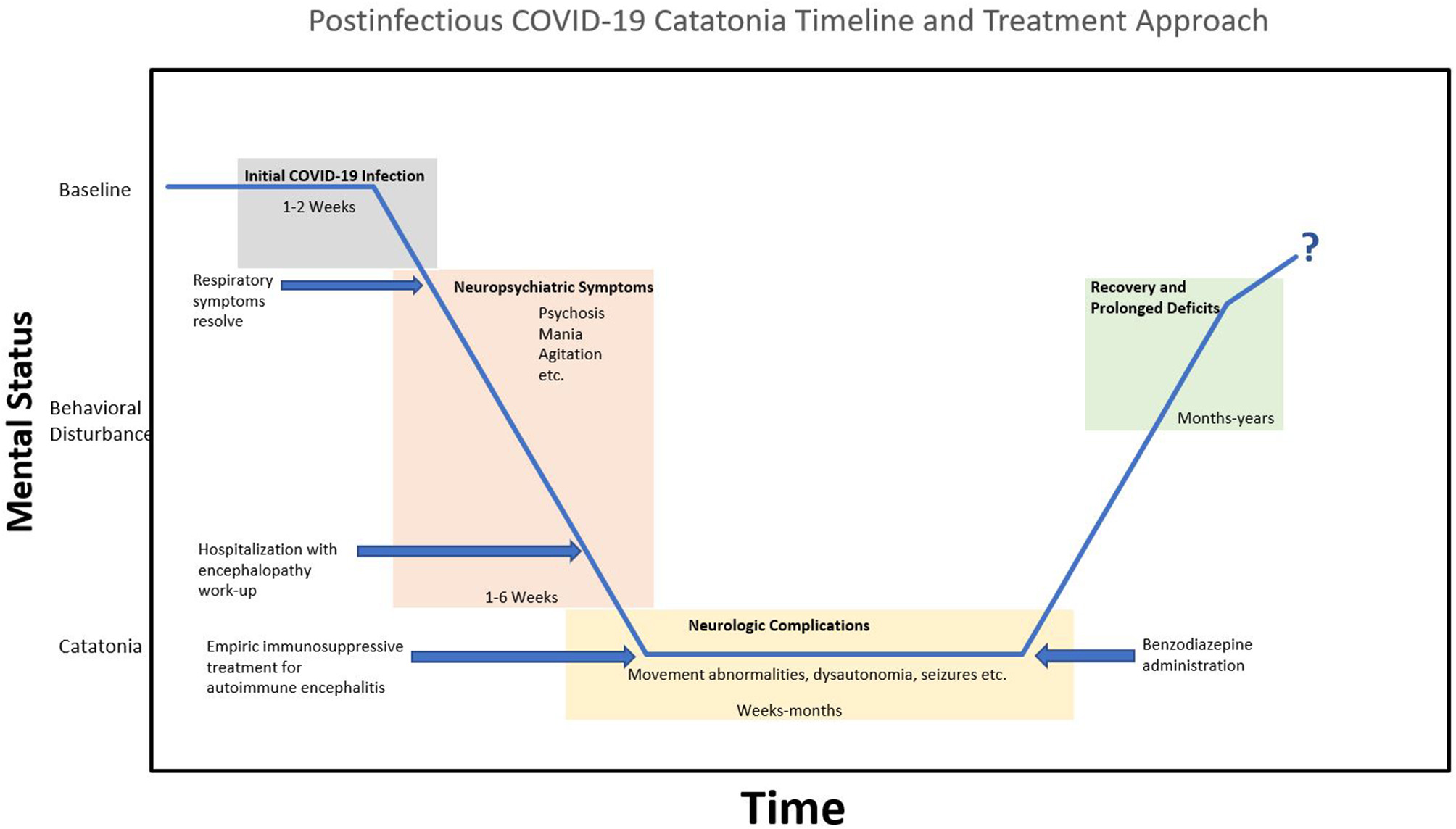 Generalized timeline of postinfectious COVID-19 catatonia and treatment approach. Initial COVID-19 infection is followed by the onset of neuropsychiatric symptoms. Hospitalization results in a typical encephalopathy work-up, revealing non-specific findings on MRI brain, EEG, and CSF findings; leading to suspicion of autoimmune encephalitis. Symptoms generally worsen with movement abnormalities and dysautonomia has been reported (i.e., malignant catatonia). With no clinical improvement after empiric immunosuppressive therapy, benzodiazepines are administered. This initiates the recovery phase, but prognosis and prolonged deficits are unknown at this time.