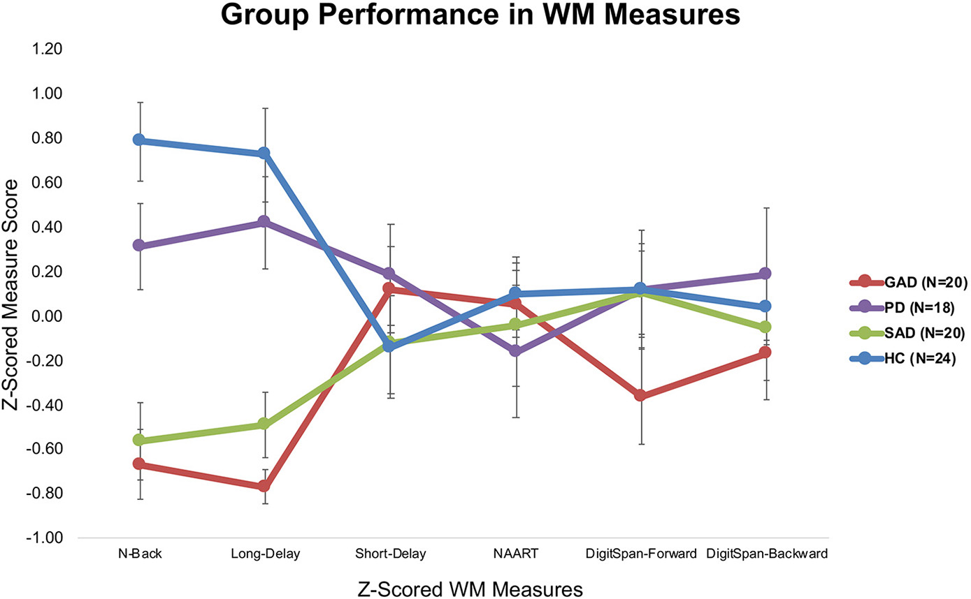 We used a mixed-model MANOVA with group as the between-subject variable (GAD, PD, SAD, HC), the WM measure type (N-back, long-delay, short-delay, NAART, digit-span forward, digit-span backward) as the within-subject variable, and the z-scored WM measures as the dependent variables (with the Wilk's correction). There was a significant group effect and a significant interaction between group and WM measures.