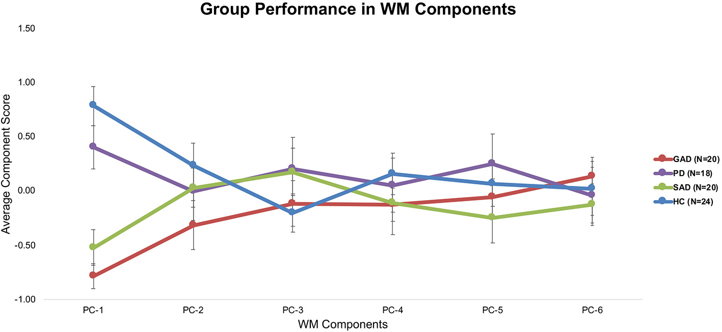Tukey's HSD post hoc tests revealed significant differences between GAD and SAD on one side and HC and PD on the other only in PC-1, which was extracted mainly from the long-delay and N-Back WM variables (Figure 3).