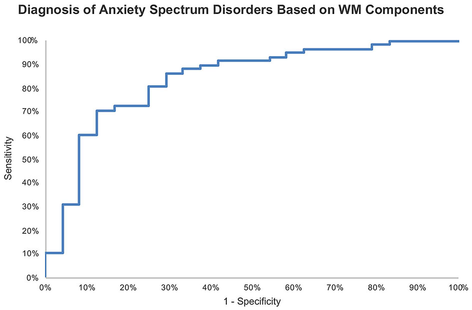 ROC analysis of the logistic regression model probabilities revealed an 83.7% accuracy for identifying for anxiety spectrum disorders based on WM components.